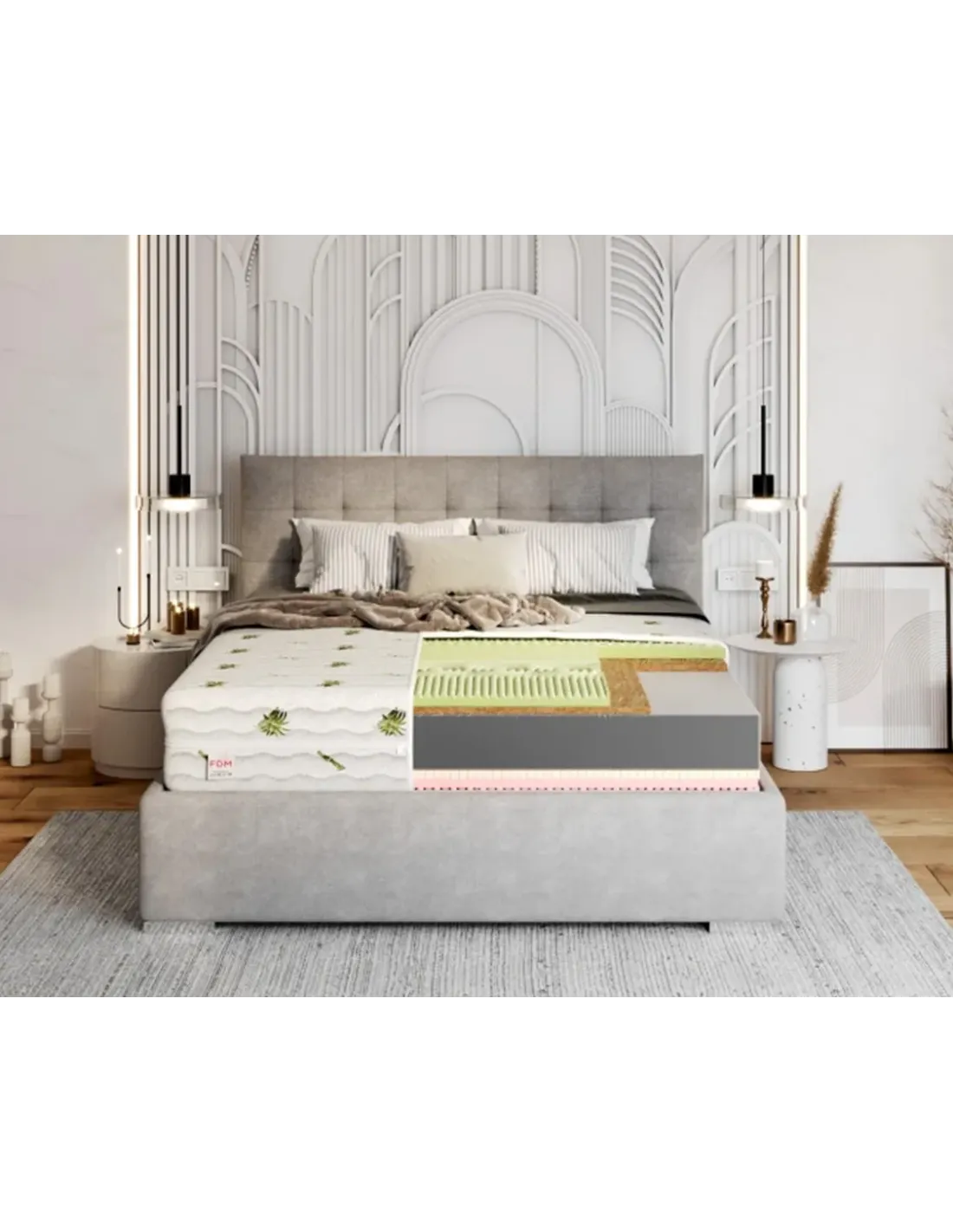 Materac SAVONA FDM wyróżnia się kompleksową, warstwową budową, która pozwala dostosować stronę użytkową do indywidualnych potrzeb. Z jednej strony znajduje się profilowana pianka HR, znana z wyjątkowej sprężystości i trwałości, oraz mata kokosowa, która zapewnia sztywność i higieniczne warunki snu. Druga strona została stworzona z myślą o maksymalnym dopasowaniu – pianka termoelastyczna VISCO reaguje na temperaturę ciała, idealnie otulając sylwetkę i niwelując nacisk, a lateks odpowiada za przewiewność, trwałość i właściwości antyalergiczne. Taki układ sprawia, że SAVONA jest idealna zarówno dla osób preferujących sztywniejsze podłoże, jak i dla tych, którzy szukają uczucia miękkiego otulenia i komfortu klasy premium.