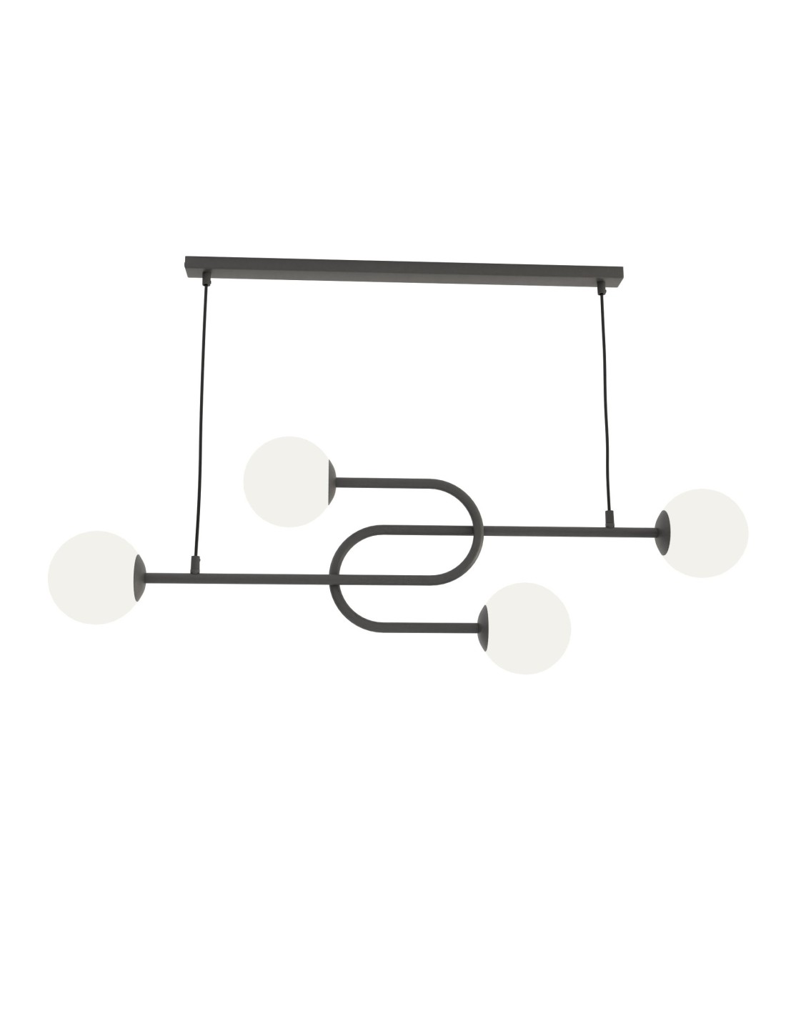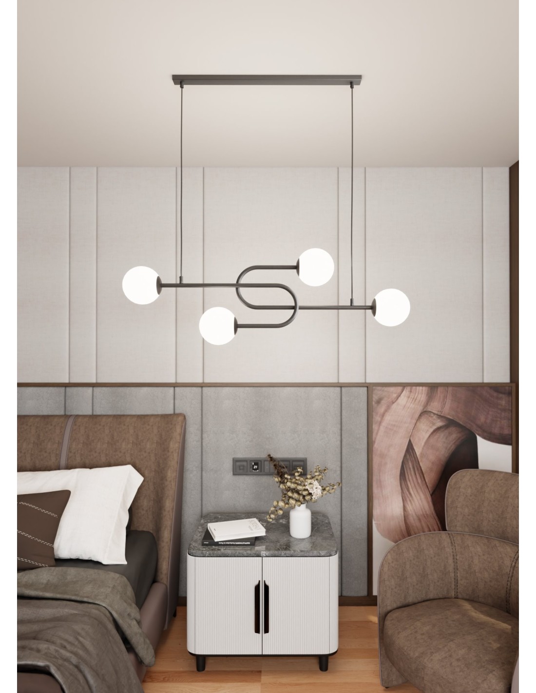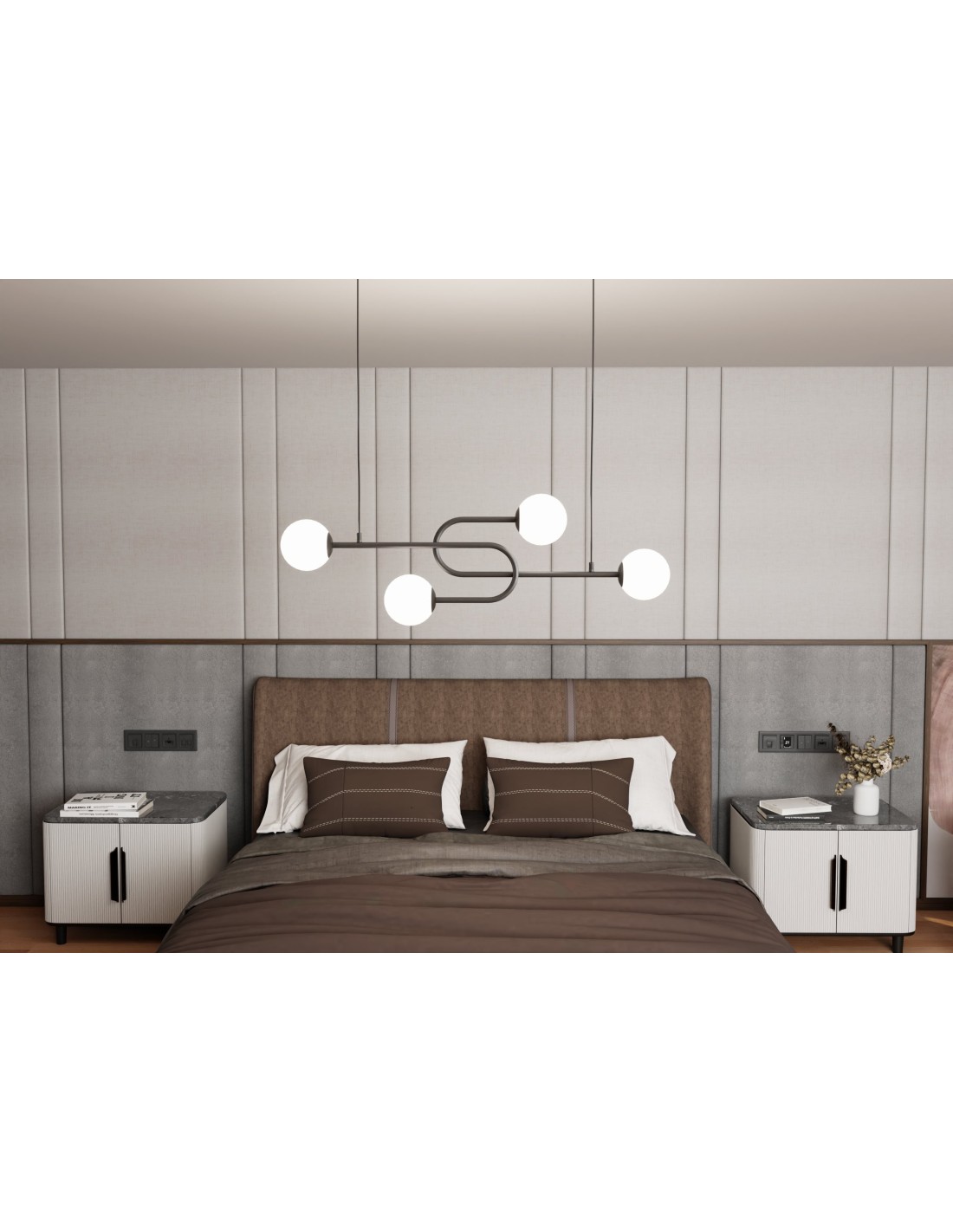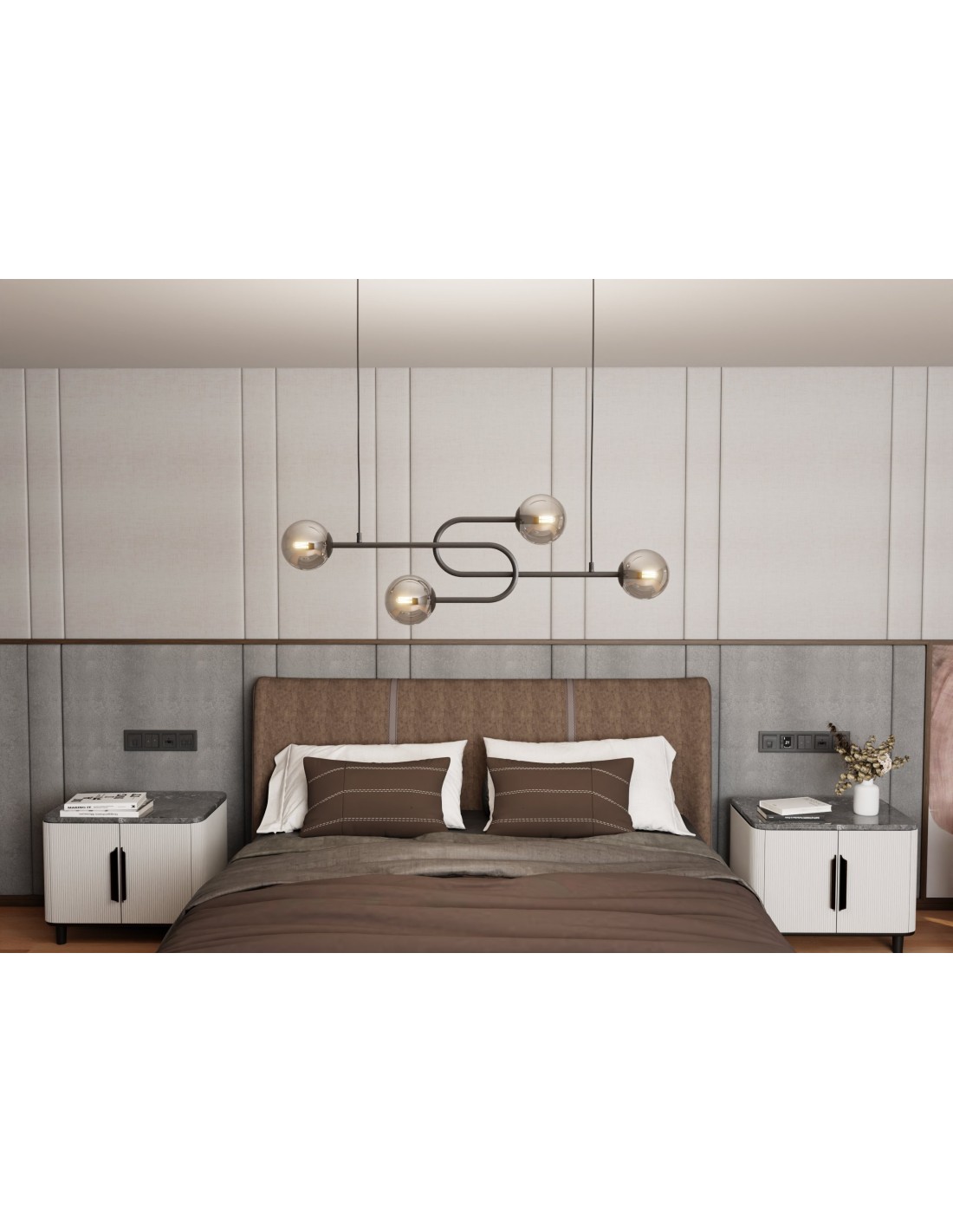 ATRIA 4 przyciąga wzrok unikalnym kształtem i starannie zaprojektowaną konstrukcją. Cztery zagięte ramiona wykonane z metalu zwieńczone zostały szklanymi kloszami, które nie tylko chronią żarówki, ale także nadają lampie elegancji i subtelnego blasku. Ich rozstaw pozwala na skuteczne oświetlenie przestrzeni bez efektu przytłoczenia.