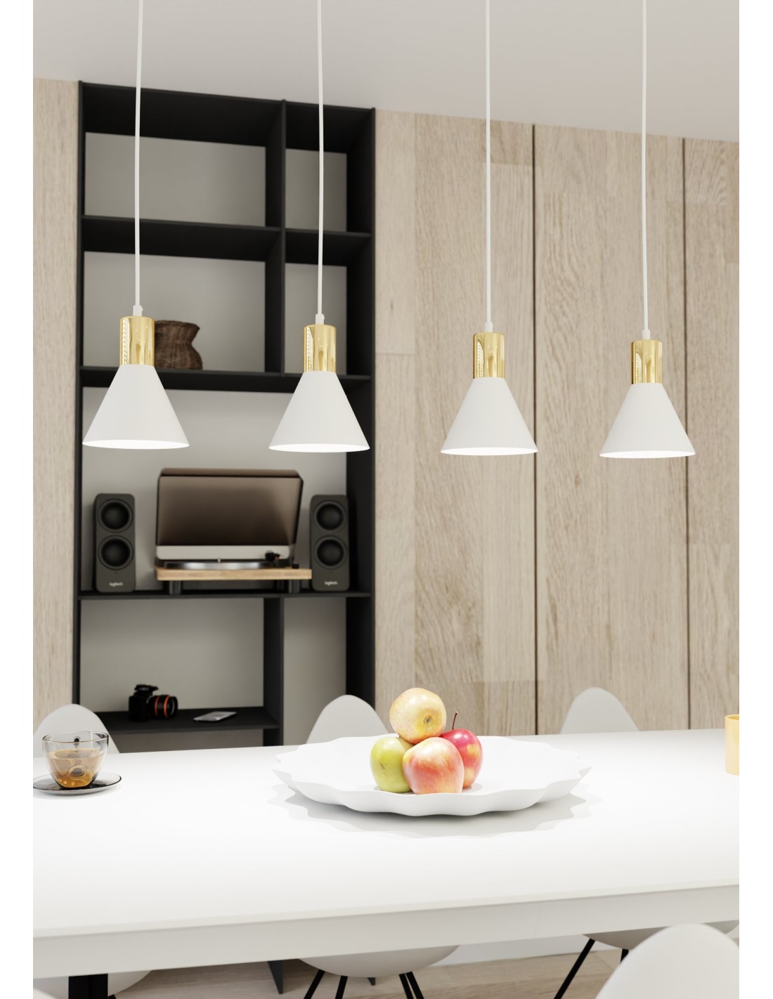 ROSA 4 wyróżnia się stożkowymi kloszami, które efektownie kierują światło w dół, podkreślając detale przestrzeni. Dzięki złotym elementom wykończenia, lampa zyskuje subtelny luksusowy charakter, jednocześnie pozostając spójną z industrialnym stylem loftowym.