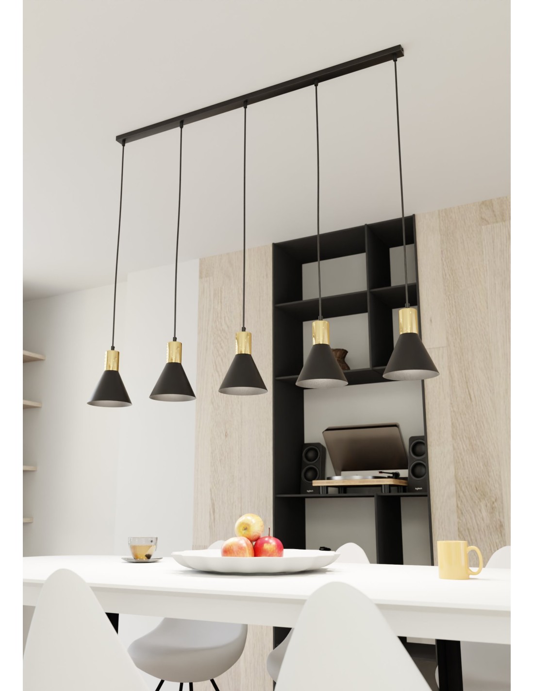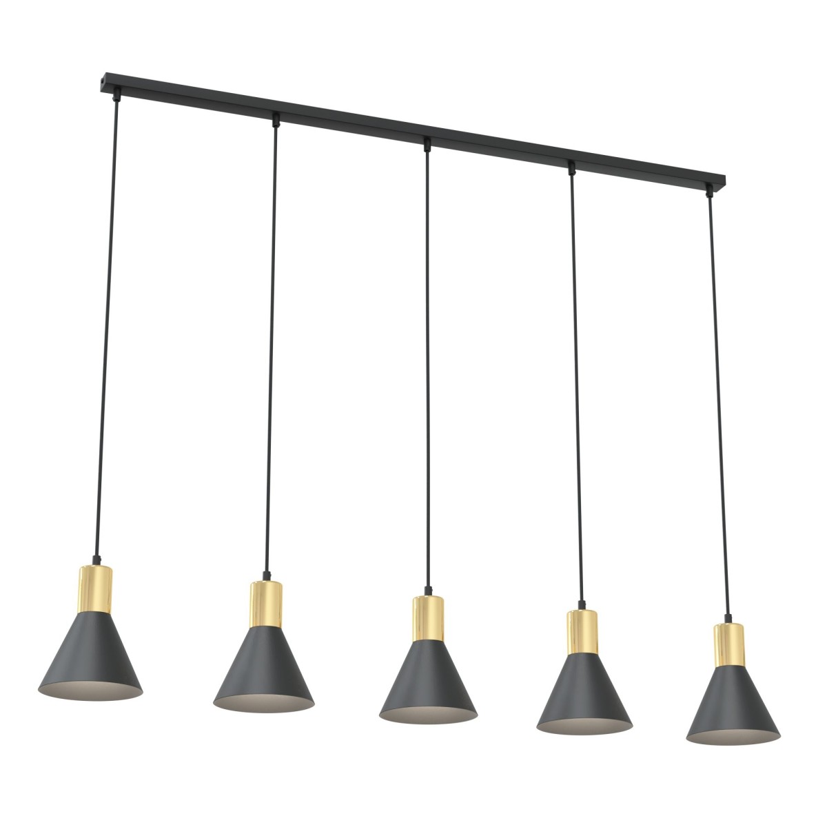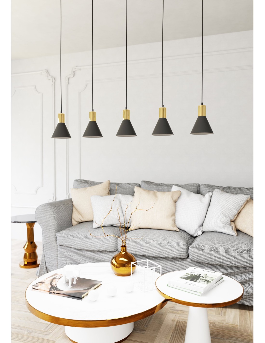 ROSA 5 przyciąga uwagę dzięki pięciu metalowym kloszom w kształcie stożków, wykończonych złotym wnętrzem, które subtelnie odbija światło. Ta kombinacja surowego metalu i ciepłego blasku wprowadza elegancki akcent do loftowych, industrialnych albo nowoczesnych wnętrz. Regulowana wysokość zawieszenia pozwala dostosować lampę do specyfiki pomieszczenia — zarówno niskiego, jak i wysokiego