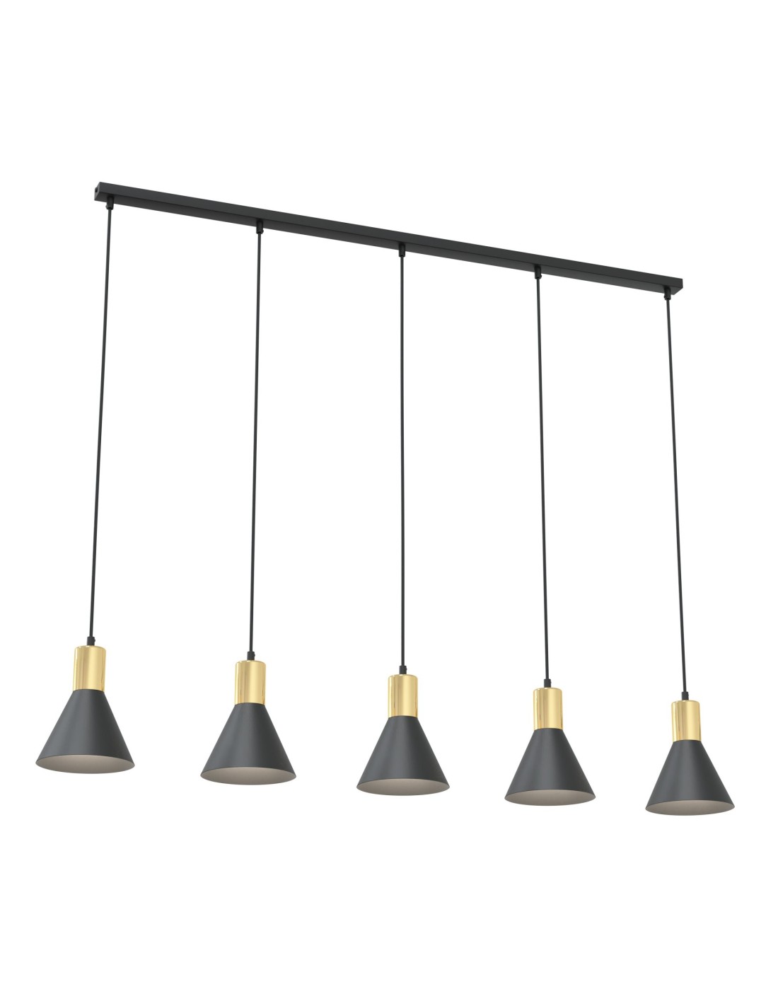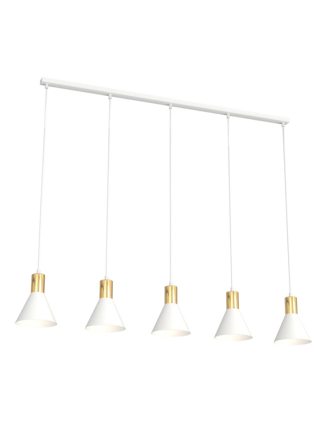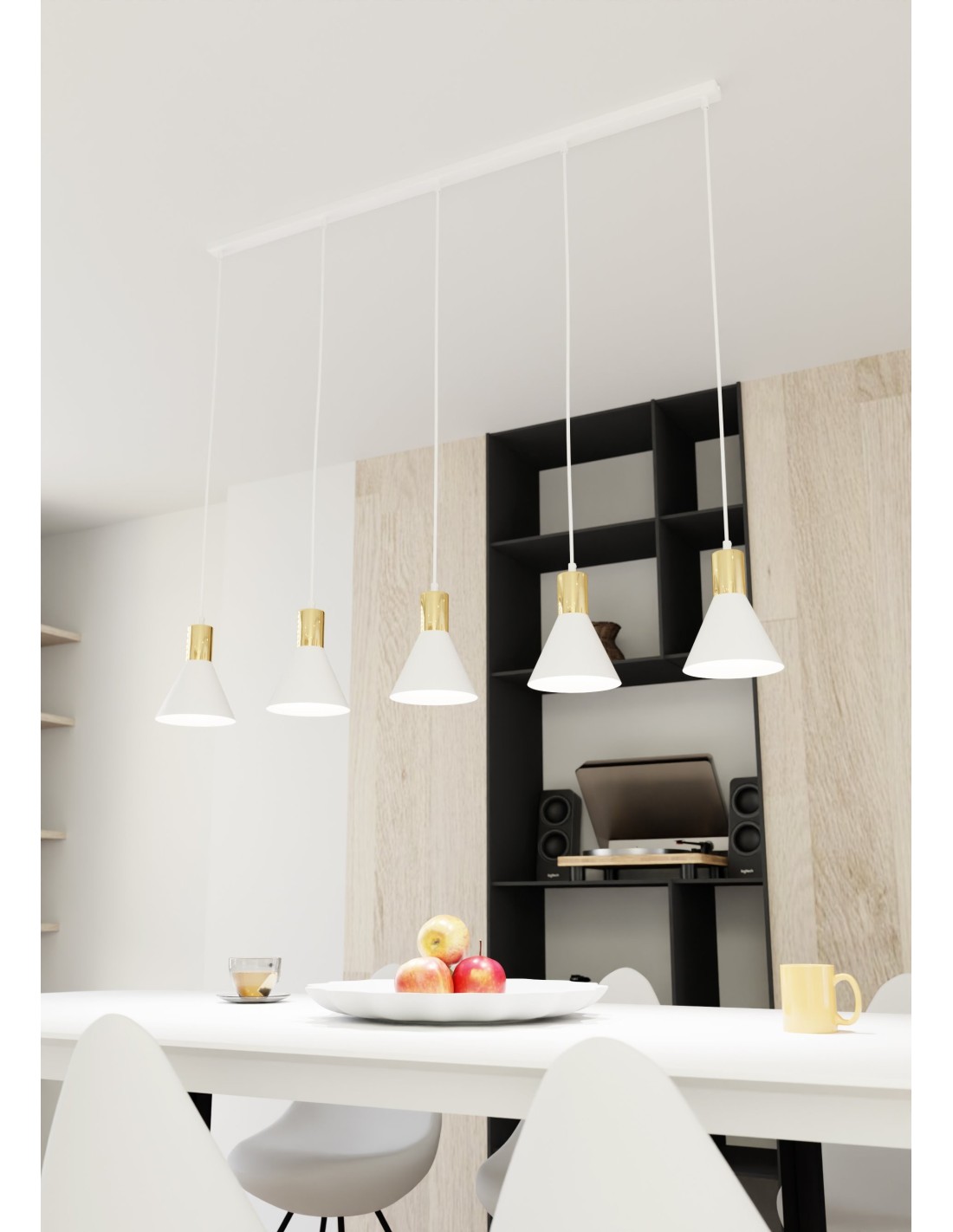 ROSA 5 przyciąga uwagę dzięki pięciu metalowym kloszom w kształcie stożków, wykończonych złotym wnętrzem, które subtelnie odbija światło. Ta kombinacja surowego metalu i ciepłego blasku wprowadza elegancki akcent do loftowych, industrialnych albo nowoczesnych wnętrz. Regulowana wysokość zawieszenia pozwala dostosować lampę do specyfiki pomieszczenia — zarówno niskiego, jak i wysokiego