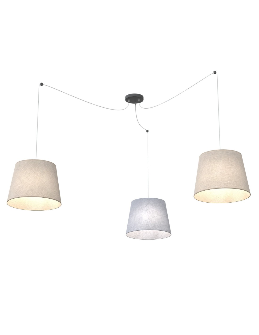 Model wyposażony jest w trzy punkty świetlne z gwintem E27 i maksymalną mocą 15W każdy, co zapewnia efektywne rozjaśnienie większych pomieszczeń. Abażury wykonane z tkaniny w kolorze beżowym, szarym lub szaro-beżowym skutecznie rozpraszają światło, tworząc miękką poświatę. Konstrukcja lampy opiera się na metalowym stelażu, który nadaje jej stabilność i trwałość. Dzięki możliwości regulacji wysokości, lampa może być łatwo dopasowana do wysokości pomieszczenia i konkretnego zastosowania – nad stołem, w salonie, a nawet w przestrzeni restauracyjnej.