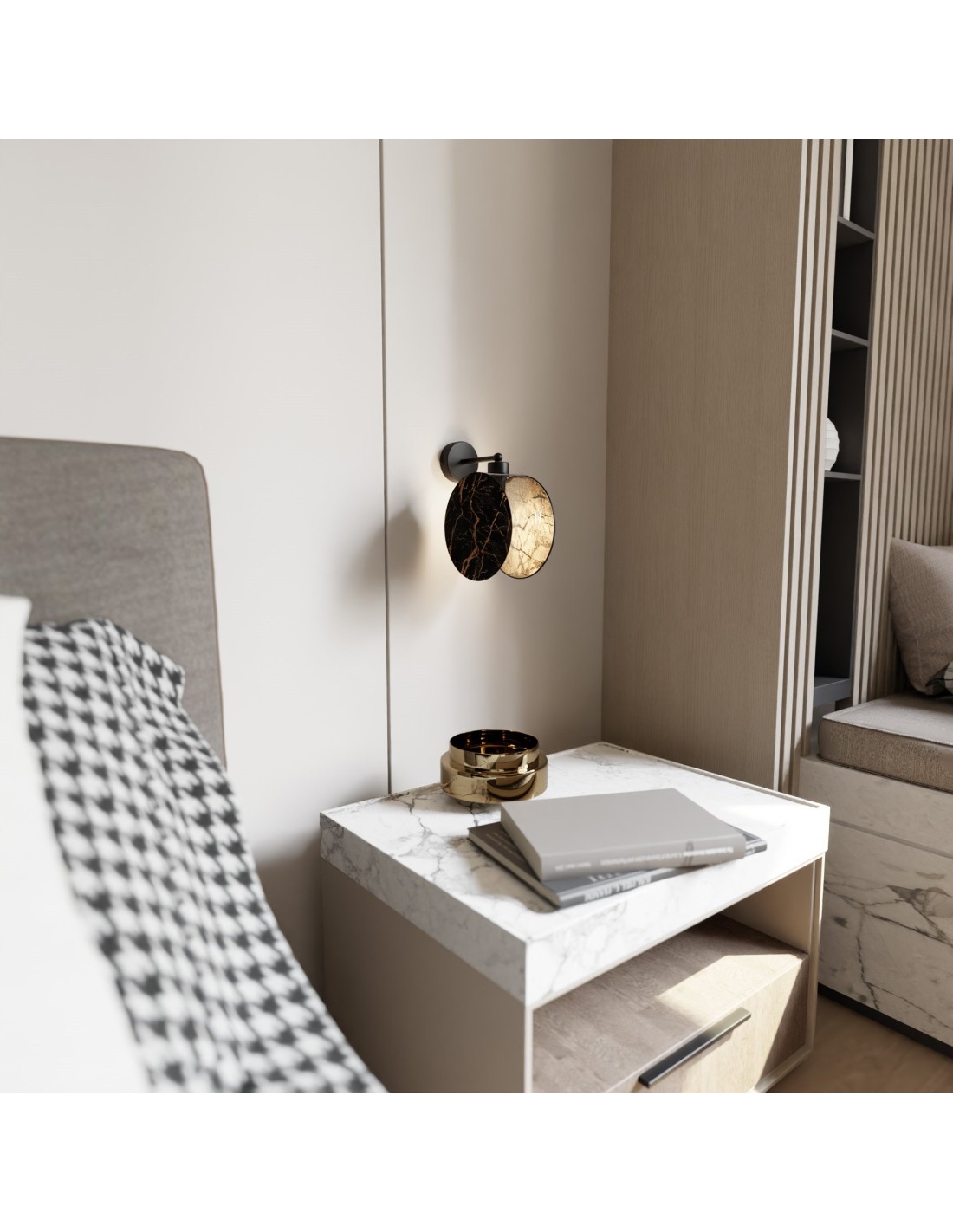 Brak możliwości regulacji wysokości podkreśla stacjonarny charakter kinkietu, co czyni go idealnym wyborem do punktowego oświetlenia stref wypoczynkowych, luster lub dekoracji ściennych. Jego obecność nie tylko zwiększa funkcjonalność przestrzeni, ale również dodaje jej stylowego wykończenia. To doskonała propozycja dla tych, którzy chcą zbudować spójną aranżację z innymi elementami serii MOTIF, tworząc harmonijną całość oświetleniową.