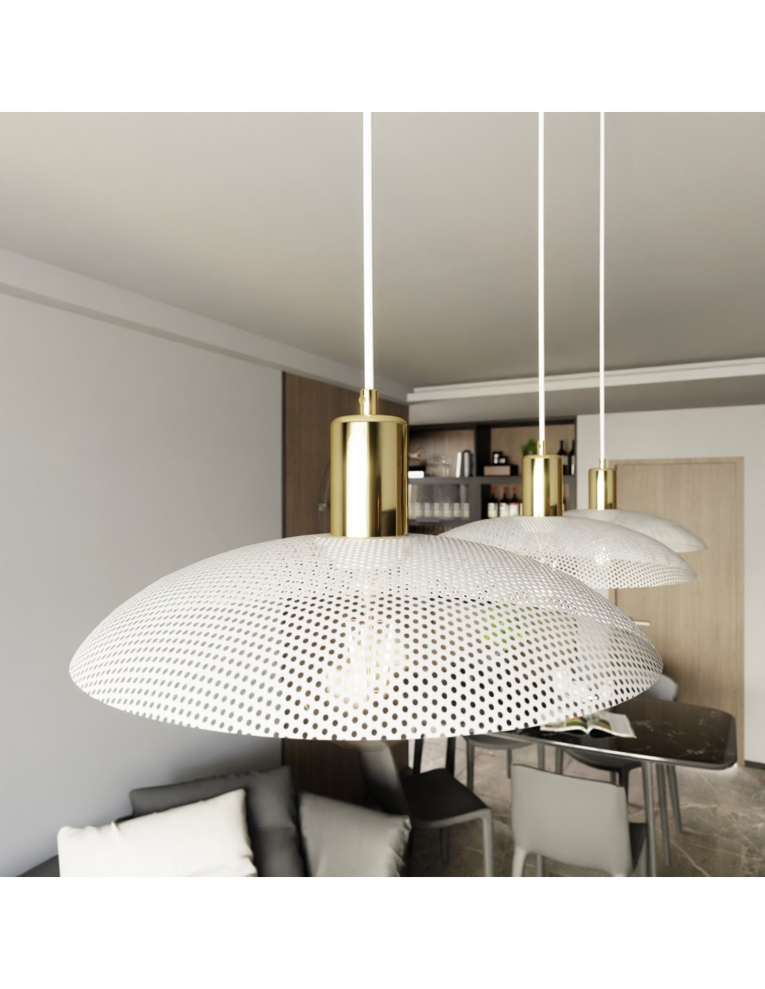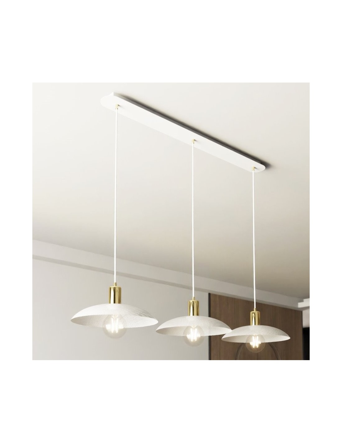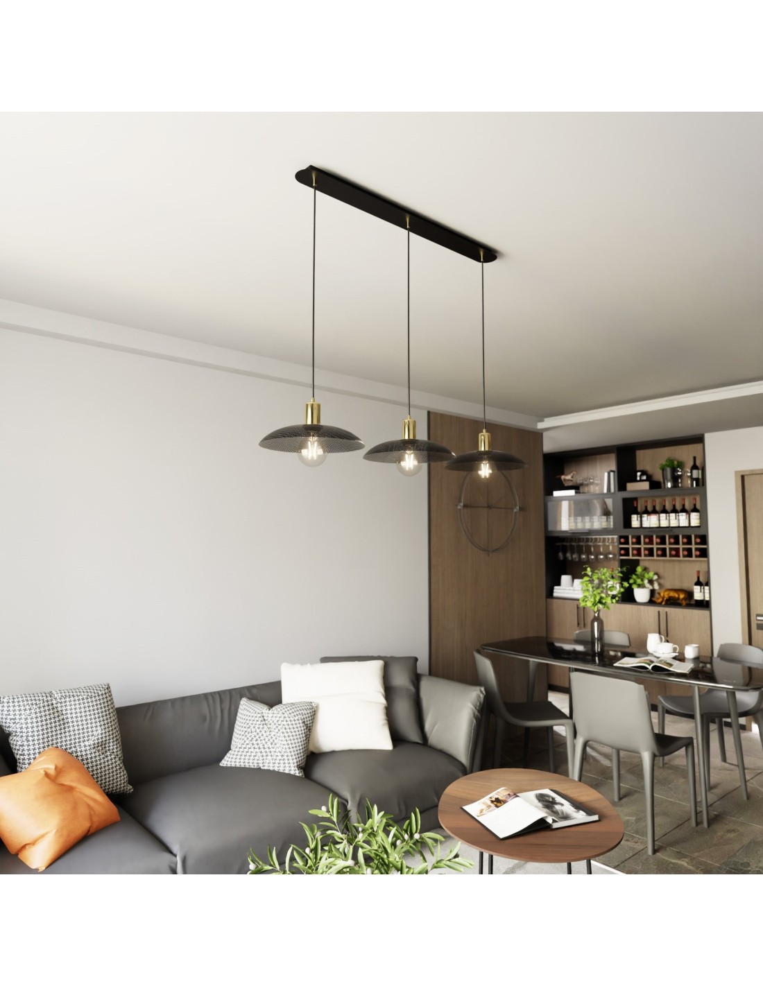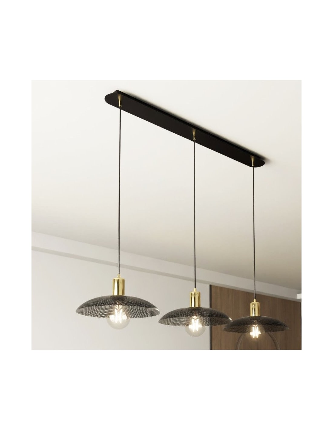 Lampa SPIRIT 3 w wersji trzypunktowej to nowoczesna propozycja oświetlenia, która łączy w sobie funkcjonalność z niebanalnym designem. Trzy metalowe klosze, każdy z charakterystyczną fakturą i złotym wnętrzem, rozświetlają przestrzeń ciepłym, przytulnym światłem, tworząc wyjątkowy klimat we wnętrzu. To rozwiązanie idealne do przestronnych pomieszczeń – kuchni z wyspą, dużej jadalni czy loftowego salonu – gdzie nie tylko potrzebne jest intensywne światło, ale też estetyczny akcent, który przyciąga wzrok.