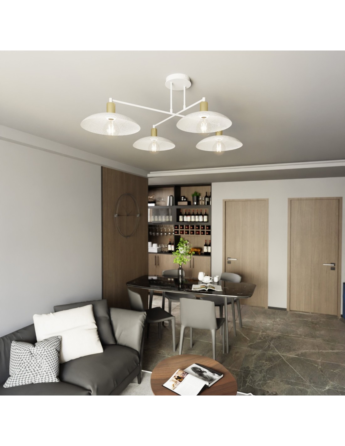 Lampa SPIRIT w wersji czteropunktowej to efektowny element oświetlenia, który wprowadza do wnętrza wyjątkowy klimat i estetykę inspirowaną stylem industrialnym z nutą elegancji. Cztery metalowe klosze z unikalną fakturą i złotym wykończeniem wnętrza zapewniają mocne i nastrojowe światło, idealne do większych przestrzeni wymagających nie tylko funkcjonalnego oświetlenia, ale również dekoracyjnego akcentu. Model ten doskonale odnajdzie się nad dużym stołem jadalnianym, w przestronnym salonie, czy w komercyjnych aranżacjach – kawiarniach, showroomach lub loftowych biurach.