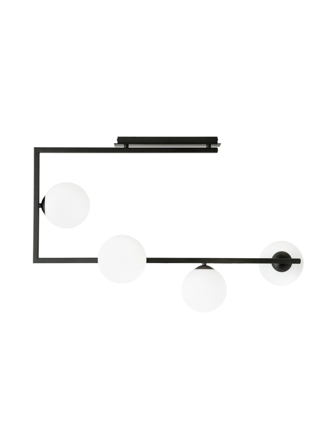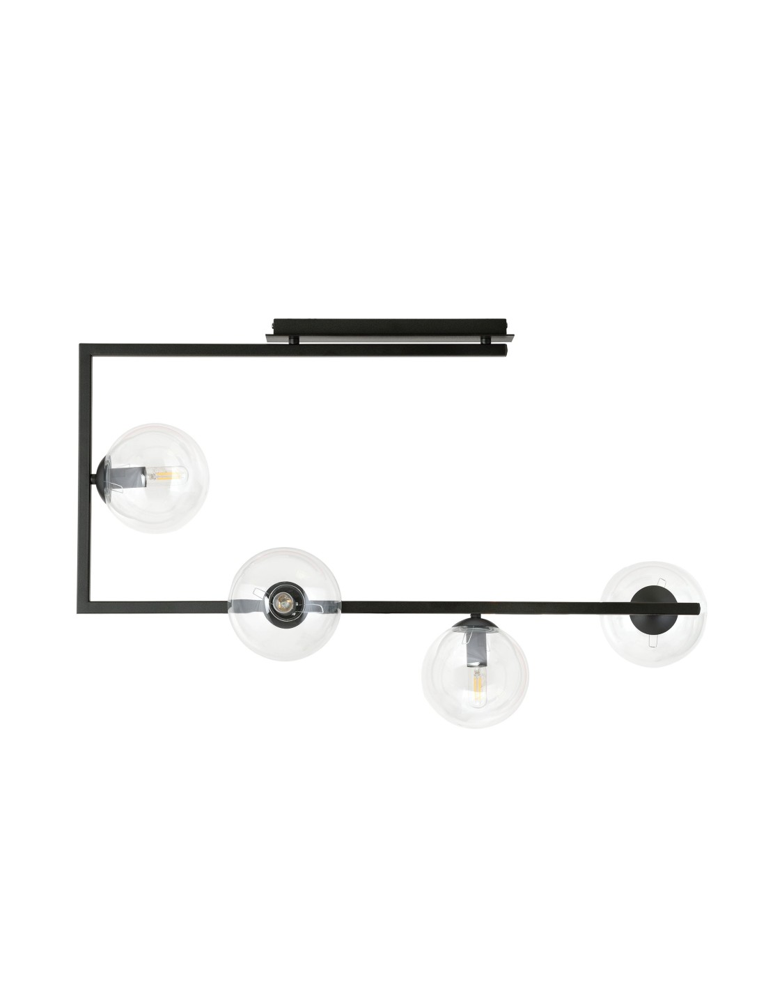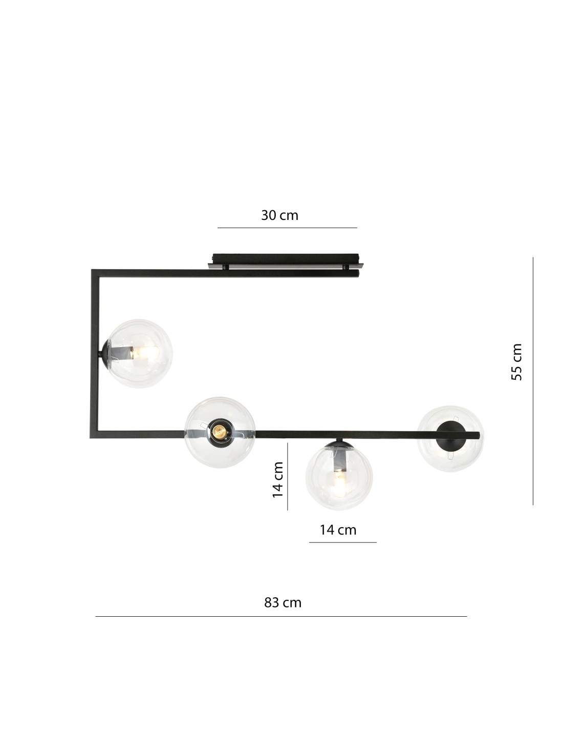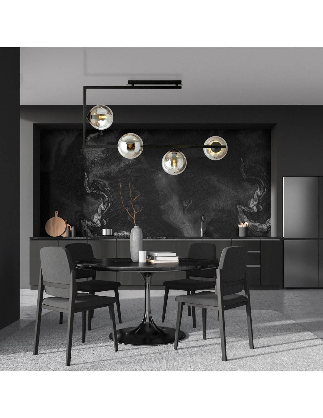 Lampa SOMA wyróżnia się połączeniem prostoty formy z dekoracyjnym wykończeniem, które przyciąga uwagę nawet w najbardziej wymagających aranżacjach. Jej konstrukcja opiera się na solidnej, metalowej ramie w kolorze czarnym, z której odchodzą cztery źródła światła zakończone szklanymi kloszami w kolorze grafitowym. Te elementy nadają lampie głęboki i stylowy wygląd, a jednocześnie zapewniają optymalne rozproszenie światła.
