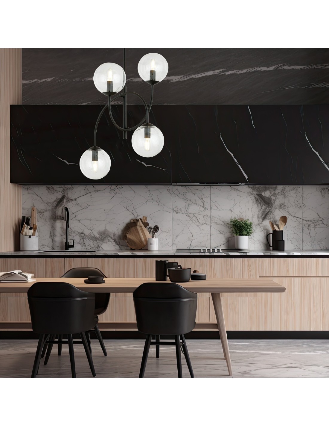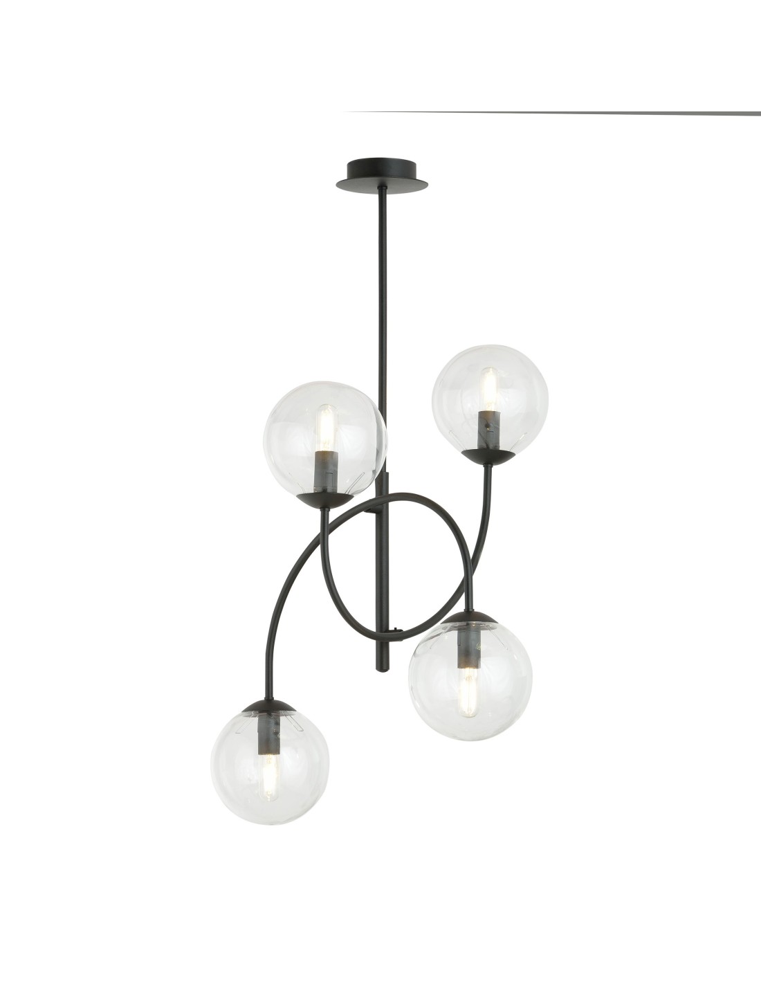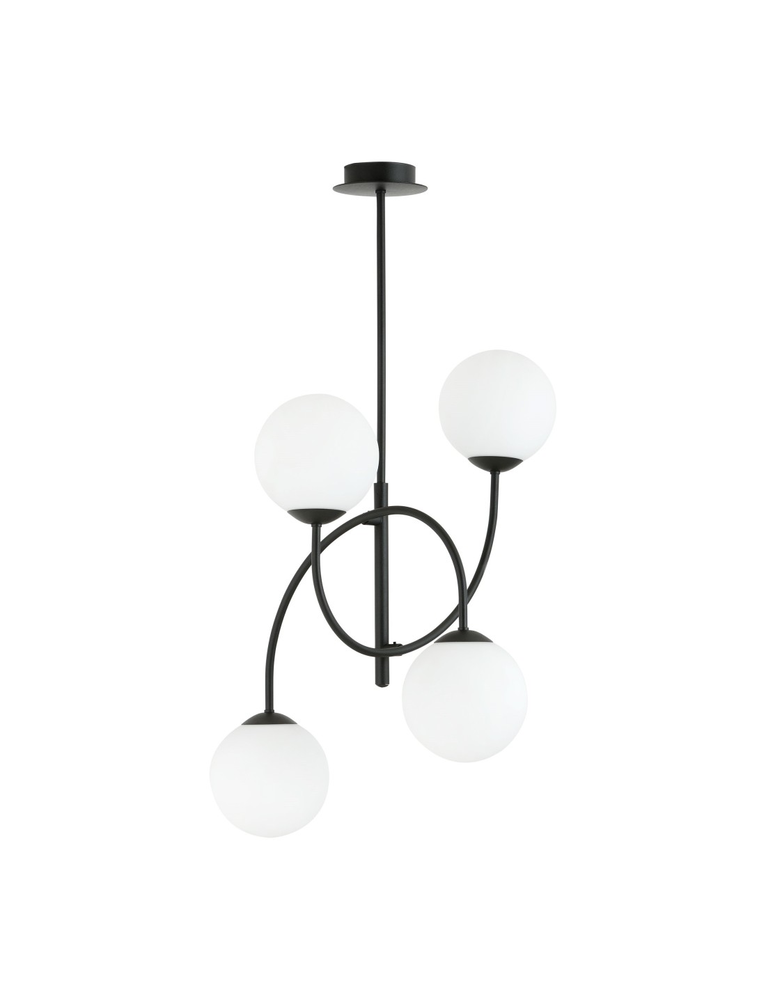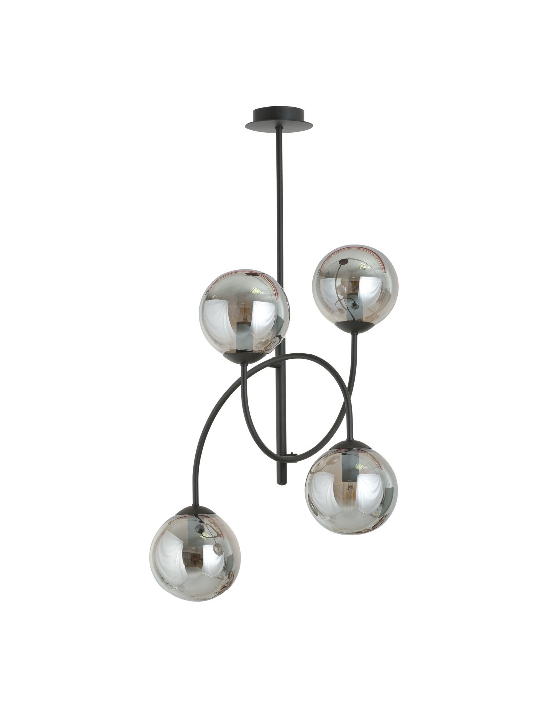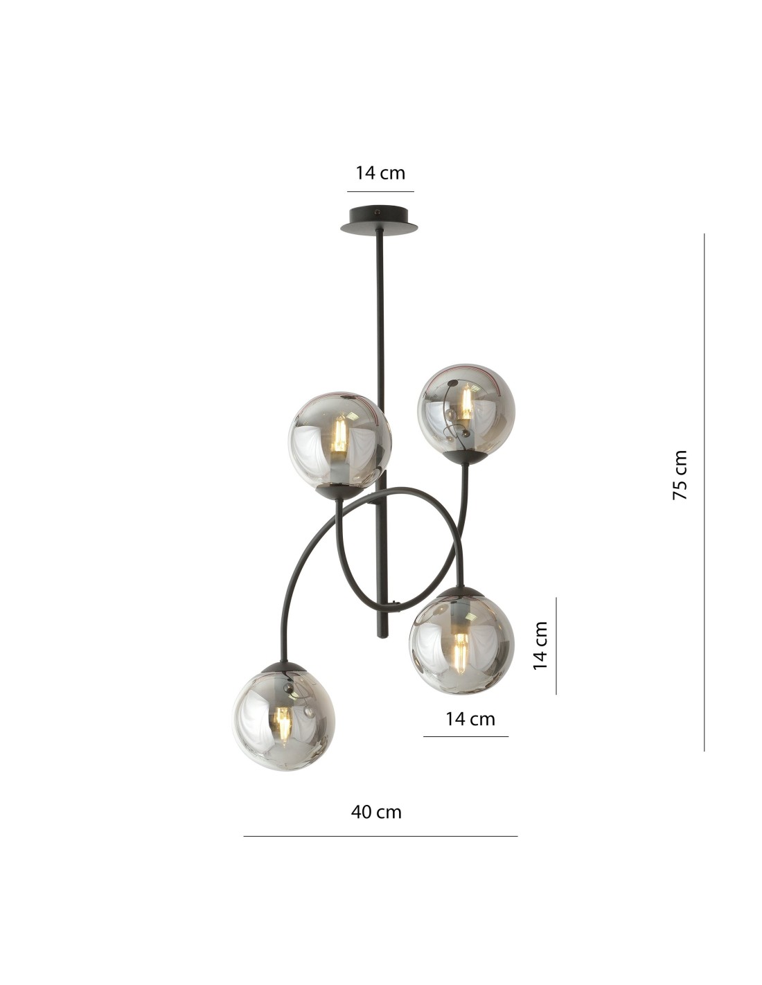 ARCHI 4B wyróżnia się staranie zaprojektowaną konstrukcją, która wpisuje się w najnowsze trendy wnętrzarskie. Cztery symetryczne ramiona zakończone okrągłymi kloszami o średnicy 15 cm wykonane ze szkła grafitowego prezentują się niezwykle nowocześnie i subtelnie zarazem. Konstrukcja lampy bazuje na metalowym, czarnym stelażu, który stanowi solidną podstawę dla delikatnych szklanych elementów.