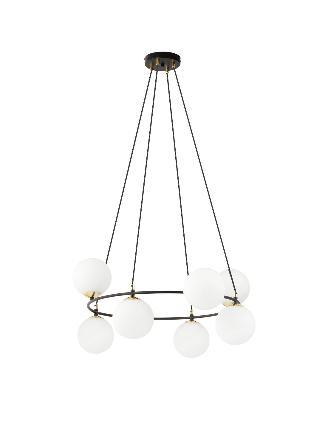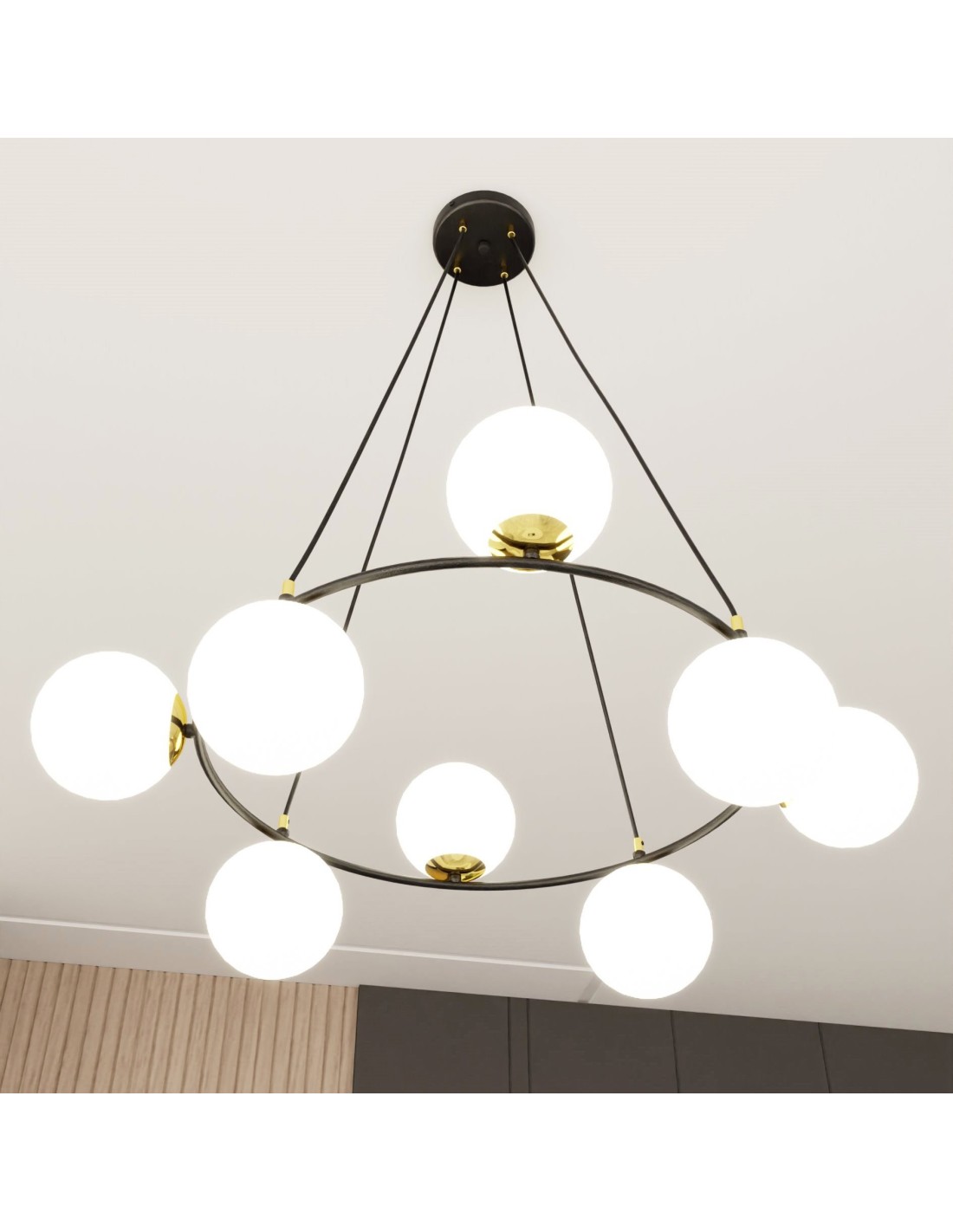 Lampa AZURA wyróżnia się nie tylko swoim unikatowym wyglądem, ale również starannym wykonaniem. Jej konstrukcja opiera się na centralnym okręgu, wokół którego rozmieszczono więcej niż siedem szklanych kloszy o średnicy 15 cm. Klosze umieszczone są w nieregularnym układzie, co daje efekt zaskakującej asymetrii, przyciągając uwagę i ożywiając każde wnętrze.