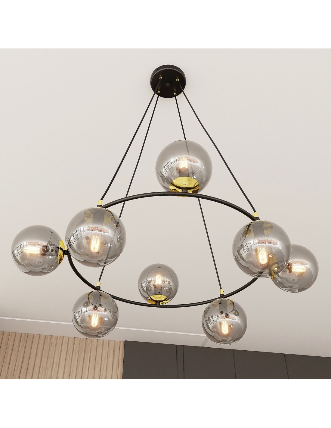 Lampa AZURA 8 to znakomite połączenie minimalistycznej elegancji z nowoczesną formą, które z łatwością przyciąga wzrok. Jej okrągła konstrukcja, wzbogacona o nieregularnie rozmieszczone klosze w odcieniu grafitu, nawiązuje do kosmicznych układów planetarnych, wprowadzając do wnętrza niebanalny, dynamiczny akcent. Czarna stal i grafitowe szkło tworzą estetyczny duet kontrastów – surowy i elegancki jednocześnie, co nadaje lampie ponadczasowy charakter.