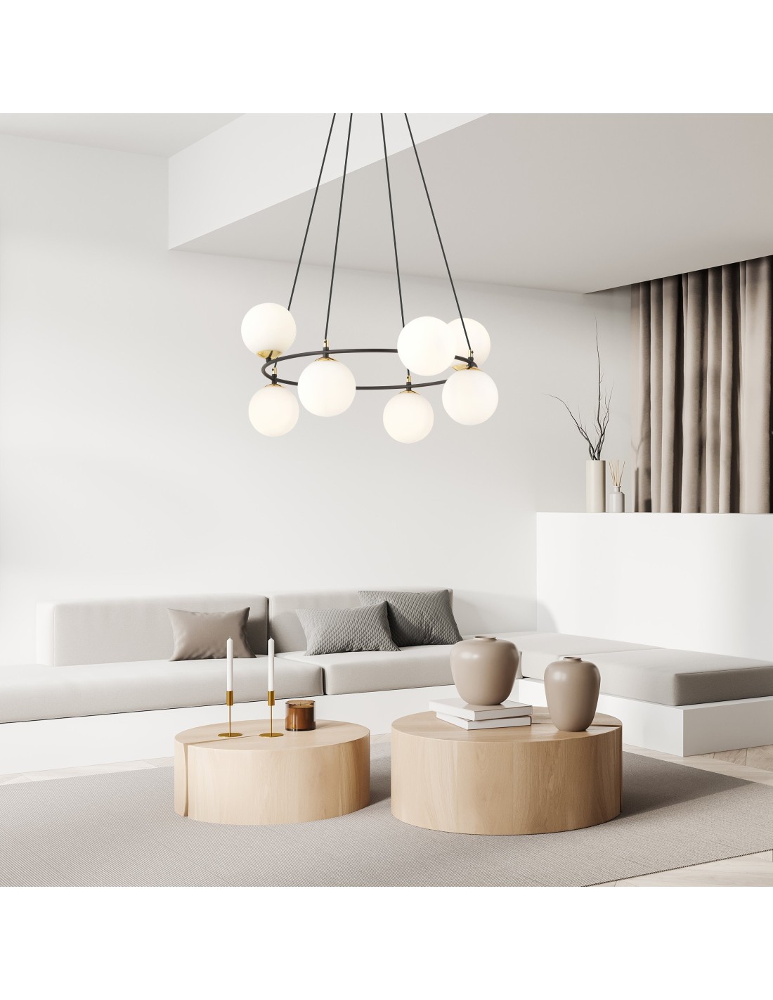 To jednak nie tylko efektowna dekoracja, lecz także funkcjonalne źródło światła. Subtelna poświata emitowana przez ponad siedem szklanych kloszy wprowadza do przestrzeni atmosferę spokoju i wyciszenia. AZURA 8 oświetla, ale również tworzy klimat – rano działa pobudzająco, w ciągu dnia podkreśla nowoczesność wystroju, a wieczorem otula wnętrze ciepłem, sprzyjając relaksowi i rozmowom.