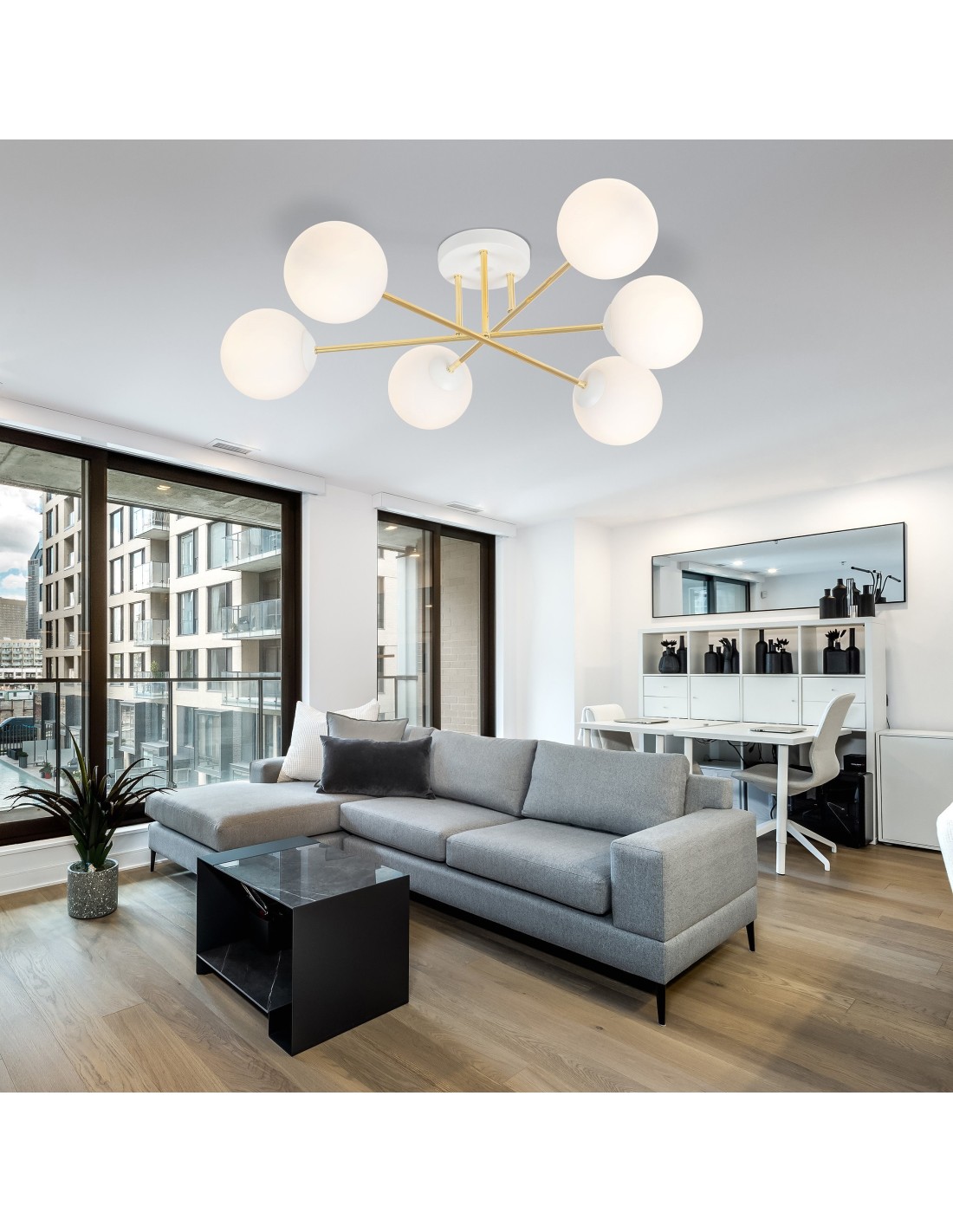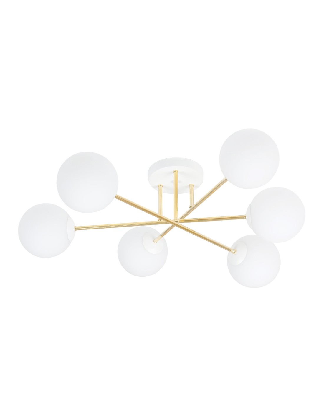 Nowoczesna lampa sufitowa MAGNUM 6 WH przyciąga wzrok eleganckim kontrastem kolorystycznym – bieli z połyskującym złotem. Taka kolorystyka nadaje wnętrzu klasę, wyrafinowanie i styl, sprawiając, że oprawa świetlna staje się istotnym elementem dekoracyjnym. Lampa wyposażona jest w sześć szklanych kloszy o średnicy 15 cm, które zostały rozmieszczone w sposób zapewniający równomierne rozświetlenie przestrzeni.