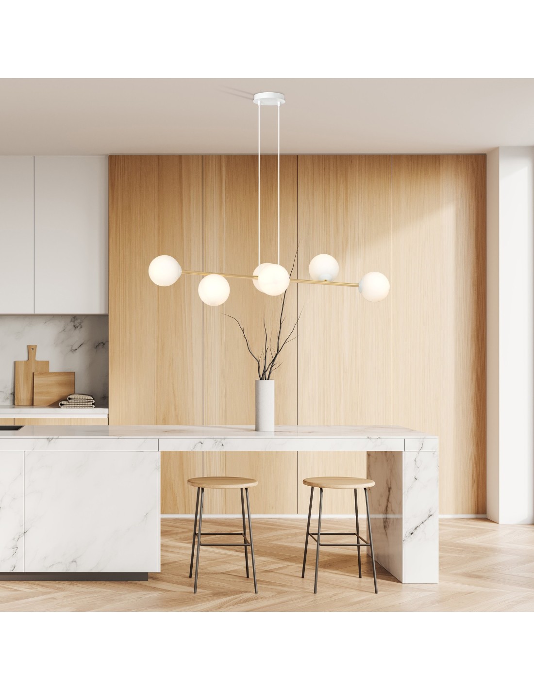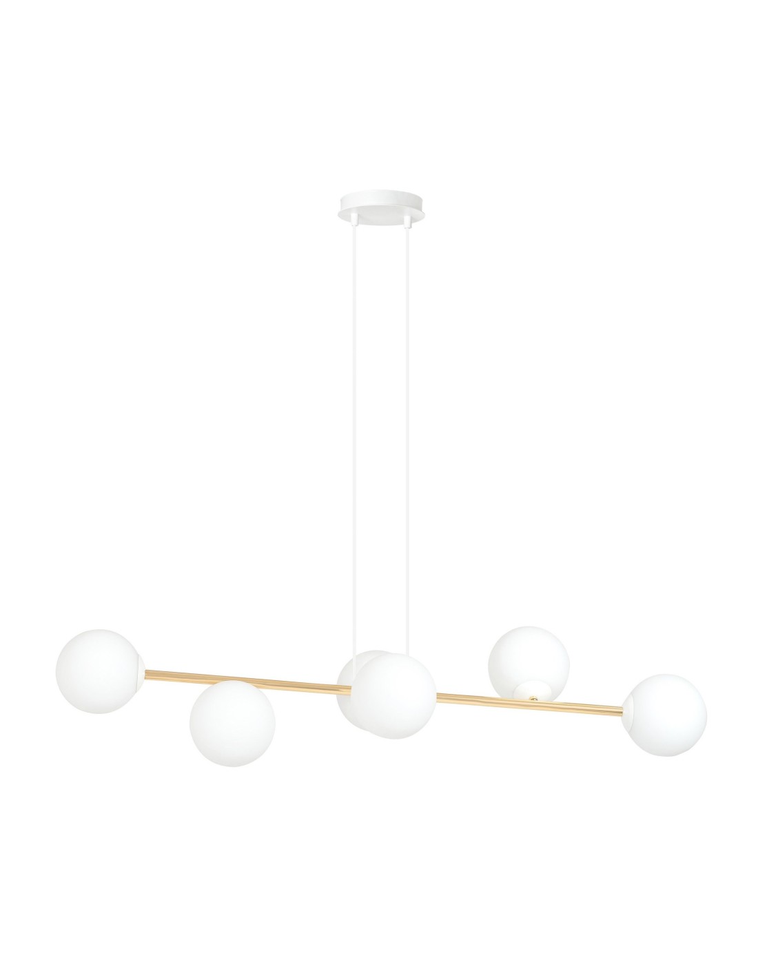 Lampa wisząca GRAVITY 6 WH zachwyca minimalistyczną linią przełamaną wyrazistym detalem. Została zaprojektowana z myślą o tych, którzy cenią eleganckie, ale nienachalne dodatki we wnętrzu. Jej konstrukcja oparta jest na centralnym, metalowym trzonie, z którego promieniście rozchodzą się ramiona zakończone szklanymi kloszami. Każdy klosz o średnicy 15 cm zapewnia delikatne, ale skuteczne światło, idealnie nadające się do codziennego użytkowania.