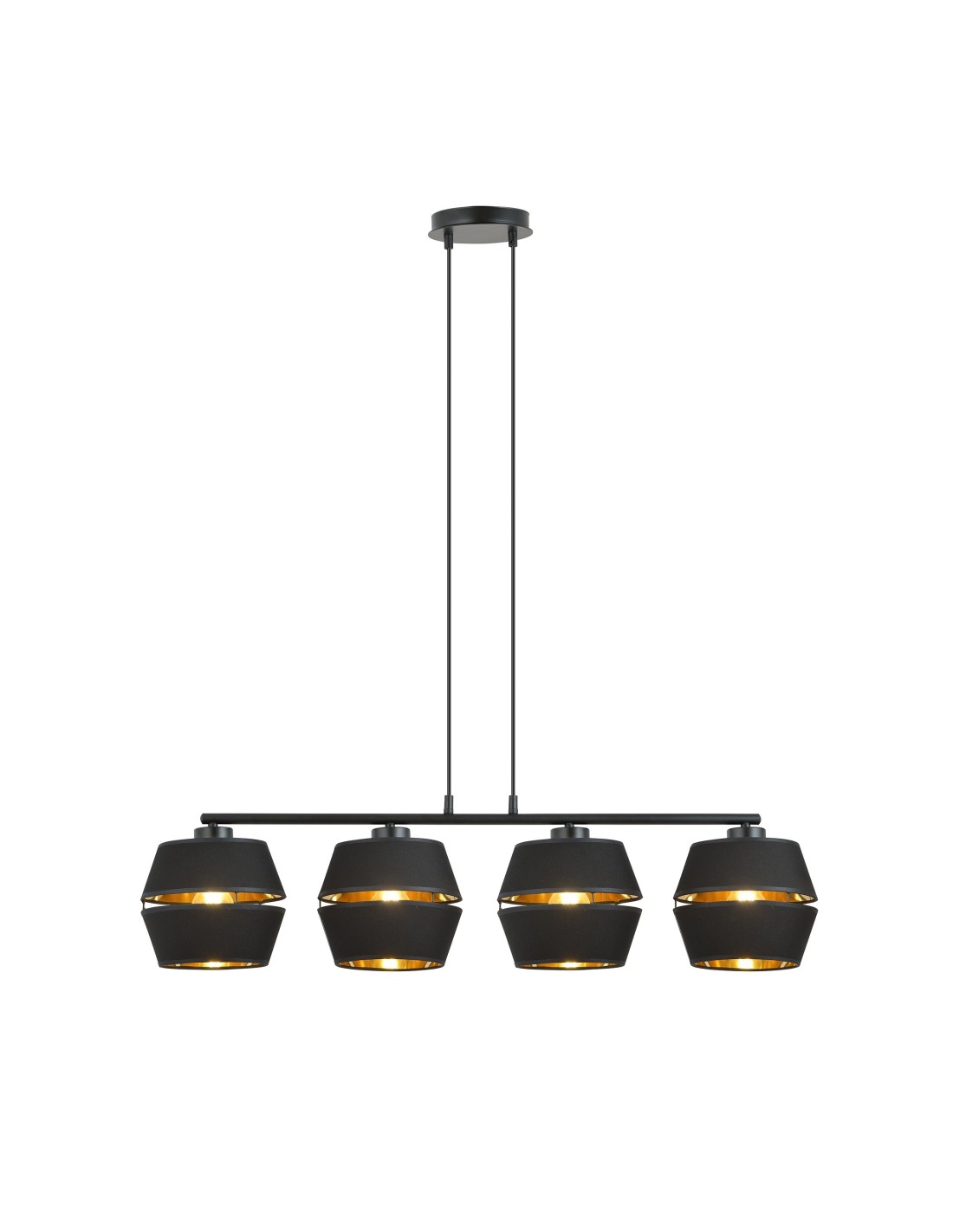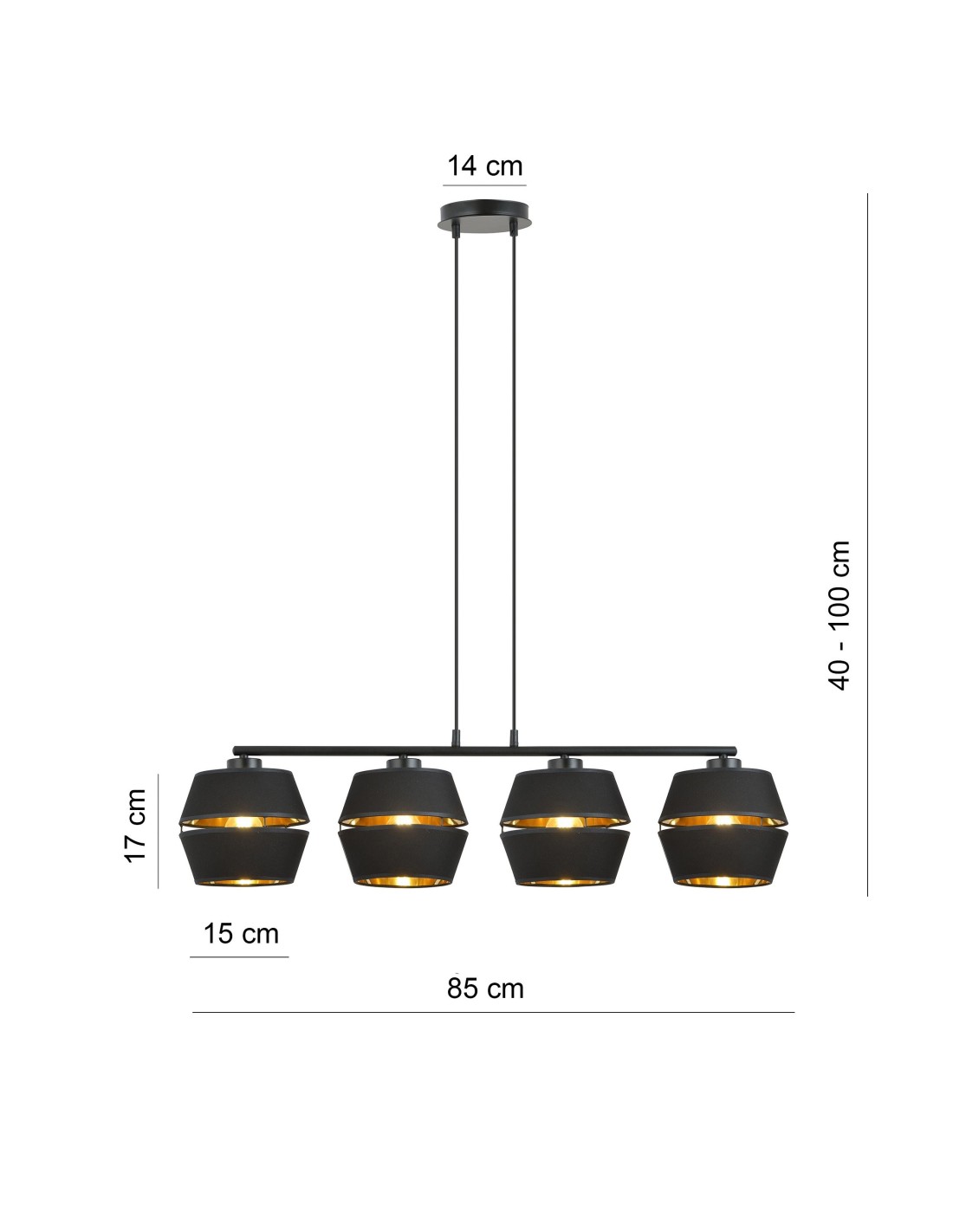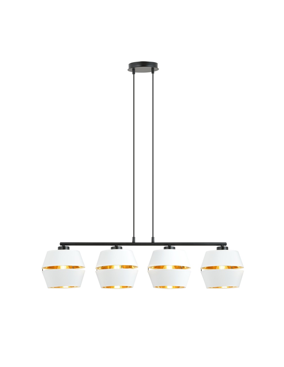 Lampa PIANO 4 to doskonały wybór do większych przestrzeni, które wymagają zarówno mocnego oświetlenia, jak i eleganckiej oprawy wizualnej. Cztery równomiernie rozmieszczone abażury tworzą efekt zorganizowanej symetrii, a złote wnętrze każdego z nich rozprasza światło w sposób, który sprzyja relaksowi i tworzy przyjazną atmosferę.