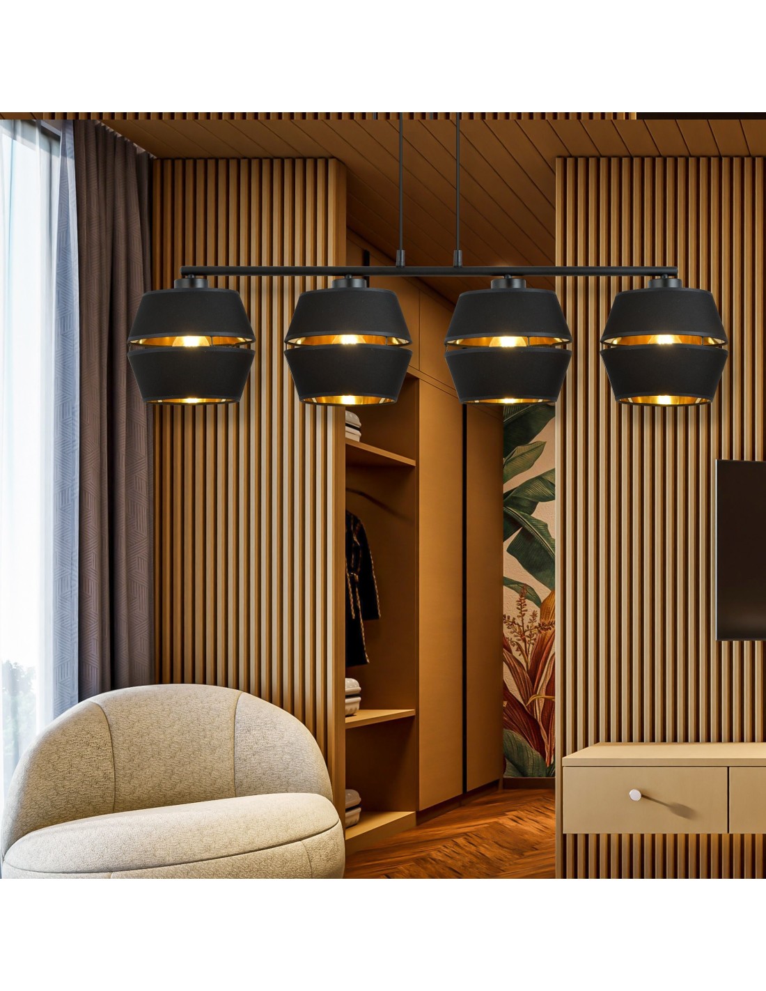 Dzięki czterem źródłom światła, PIANO 4 doskonale rozświetla przestrzeń, tworząc ciepły, nastrojowy klimat. Idealna do salonów, jadalni czy przestrzeni komercyjnych, które potrzebują nie tylko funkcjonalnego oświetlenia, ale również elementu dekoracyjnego o silnym charakterze. Złote wnętrze kloszy pięknie odbija światło, potęgując jego efekt i wprowadzając do wnętrza atmosferę luksusu.
