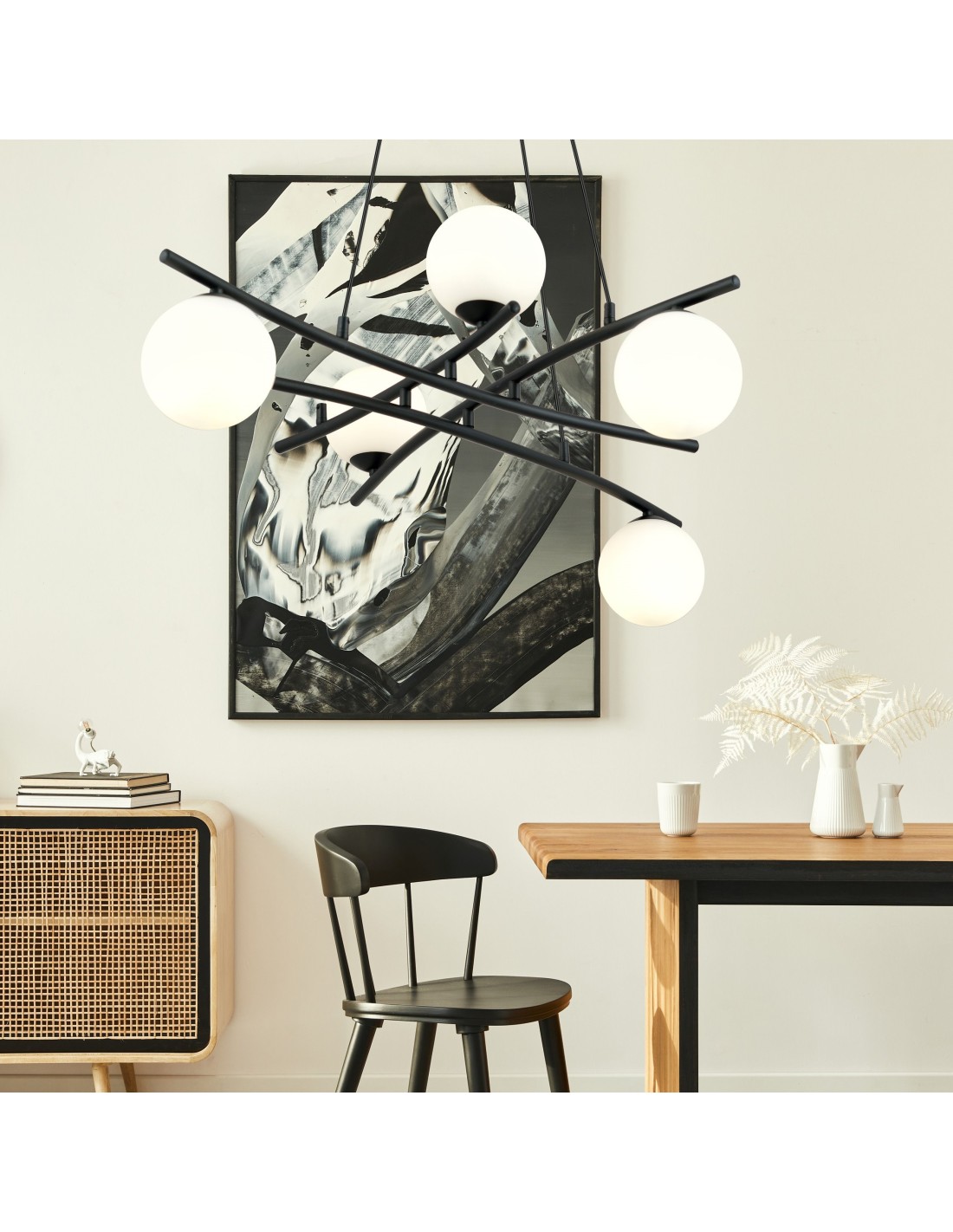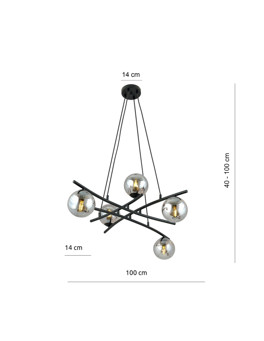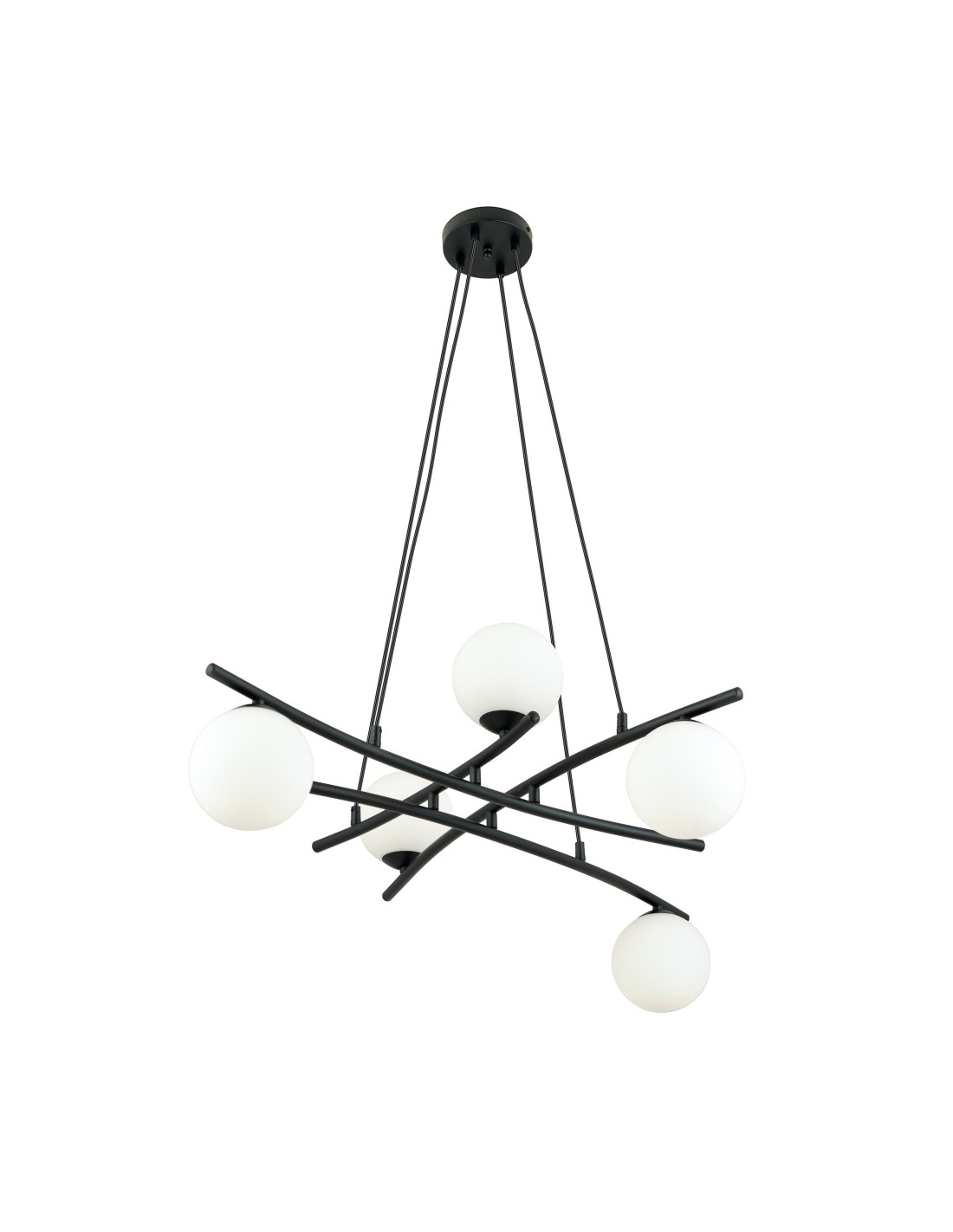 Lampa wisząca ESSA 5 została zaprojektowana z myślą o tych, którzy chcą stworzyć przestrzeń z charakterem. Jej rozbudowana, promieniście rozchodząca się konstrukcja przyciąga wzrok i nadaje wnętrzu niepowtarzalnego stylu. Światło emitowane przez szklane klosze o średnicy 15 cm rozprzestrzenia się równomiernie, tworząc ciepłą i przytulną atmosferę.
