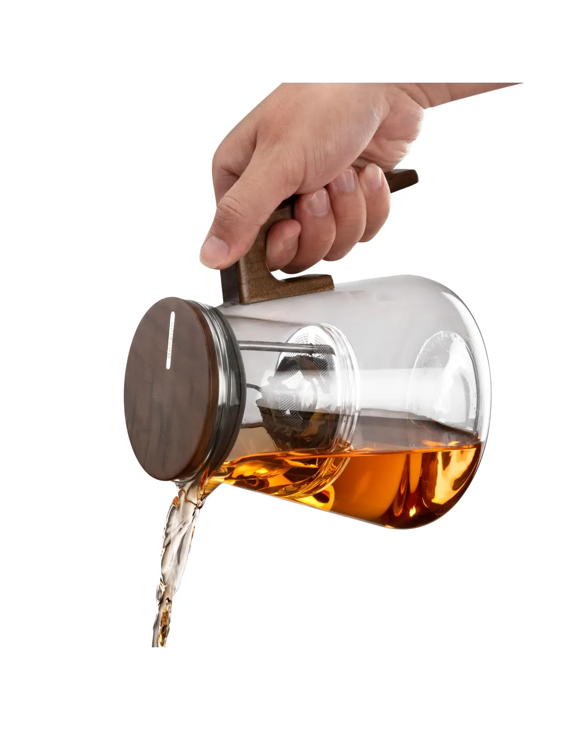 Ogromnym atutem czajniczka jest magnetycznie zamykana pokrywa wykonana z drzewa orzechowego. Naturalne drewno wprowadza ciepły, premium charakter i świetnie kontrastuje z nowoczesną formą dzbanka, tworząc efektowny element zastawy. Magnetyczne domknięcie poprawia stabilność podczas nalewania, a sama pokrywa dobrze leży w dłoni, co ułatwia obsługę mechanizmu przekręcania. To rozwiązanie, które robi wrażenie nie tylko wyglądem, ale też wygodą – szczególnie gdy parzysz herbatę kilka razy dziennie i zależy Ci na sprawnym działaniu bez bałaganu.