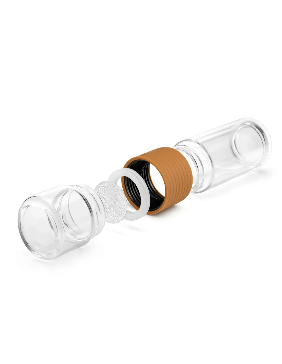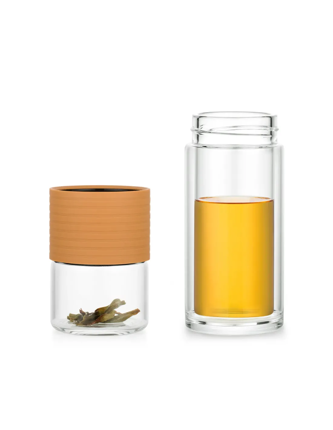 Szklany bidon-zaparzacz wyróżnia się praktyczną budową z podwójną ścianką ze szkła borokrzemowego, która zwiększa bezpieczeństwo i komfort trzymania oraz pomaga dłużej utrzymać temperaturę napoju. Zestaw posiada mniejszą szklaną komorę zaparzacza, do której wsypujesz liście, oraz drobny filtr ze stali nierdzewnej, który łączy obie części i zatrzymuje drobinki. Parzenie odbywa się poprzez proste przechylenie butelki pod kątem 45°, dzięki czemu woda trafia do komory z herbatą, a po uzyskaniu odpowiedniej mocy naparu wystarczy ustawić bidon pionowo, by zakończyć proces. To rozwiązanie świetnie sprawdza się w domu, biurze i w podróży, pozwalając parzyć napój dokładnie tak, jak lubisz – bez fusów i bez zbędnych akcesoriów.