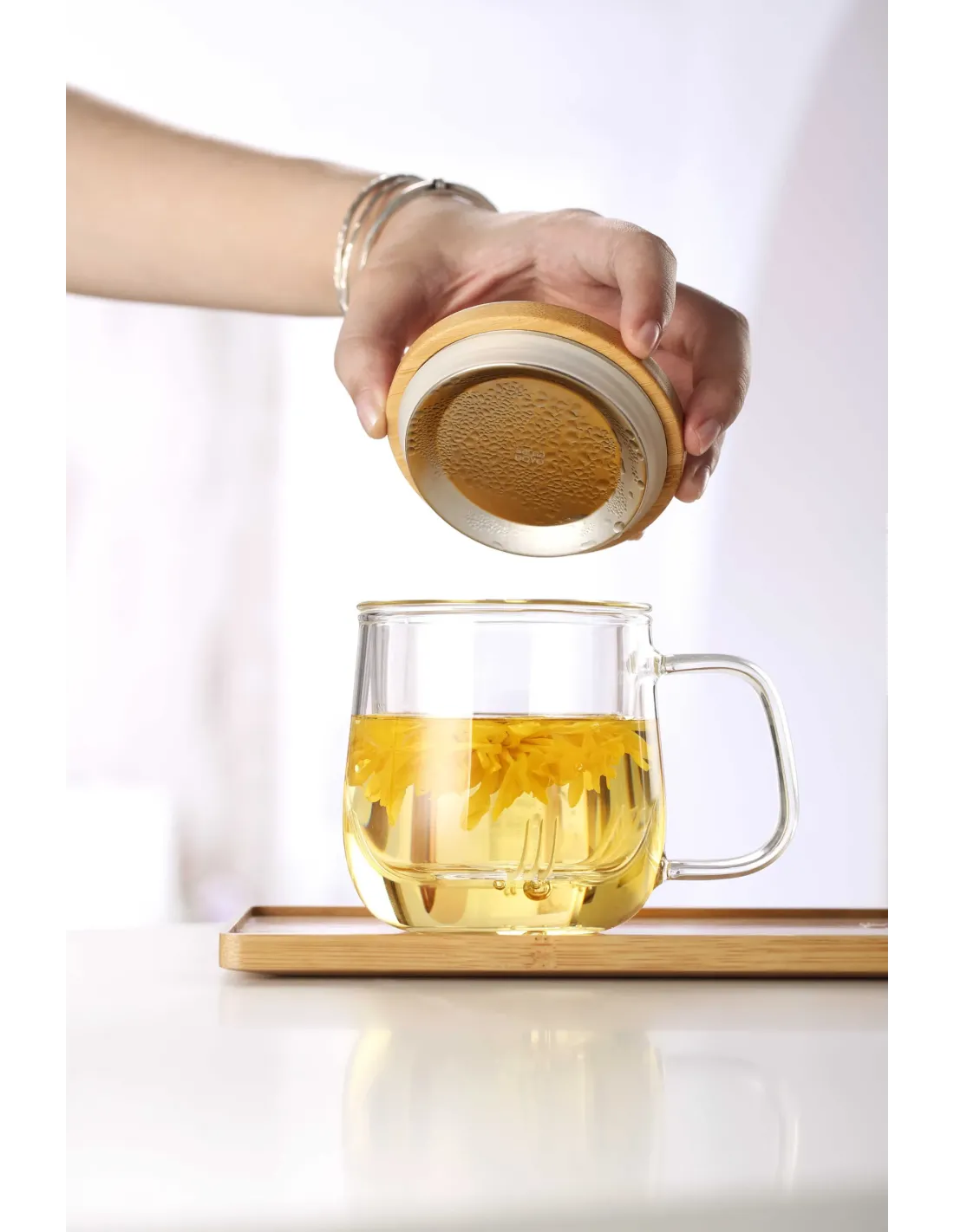 Szklany uchwyt i pokrywka stal–bambus – parzenie bez fusów i utrzymanie temperatury