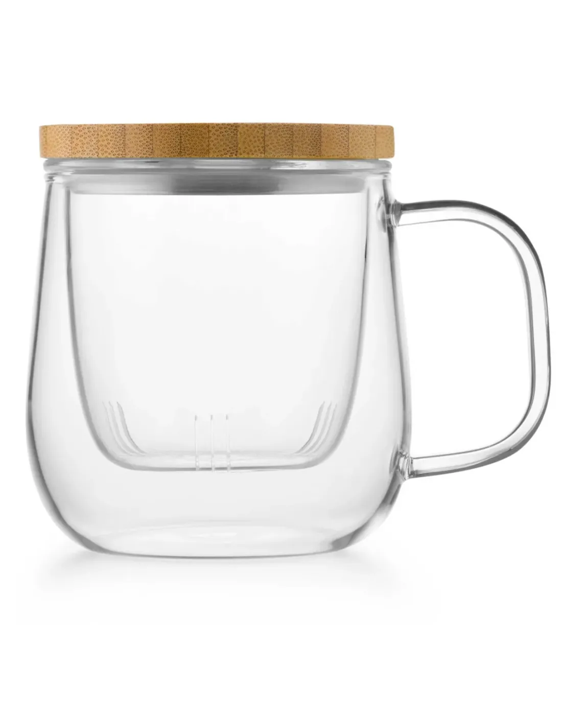 W zestawie znajduje się szklany zaparzacz, dzięki któremu przygotujesz herbatę lub zioła bez fusów w napoju. To rozwiązanie bardzo praktyczne: parzysz liście w osobnym wkładzie, a po osiągnięciu odpowiedniej mocy łatwo oddzielasz je od naparu. Dzięki temu możesz zachować delikatność smaku i uniknąć zbyt długiego parzenia, które często powoduje goryczkę. Całość zamyka pokrywka wykonana ze stali i drewna bambusowego odpornego na działanie wilgoci. Taka pokrywka pomaga utrzymać temperaturę naparu, osłania zawartość i dodaje całości eleganckiego, naturalnego charakteru – bambus pięknie komponuje się z przezroczystym szkłem.