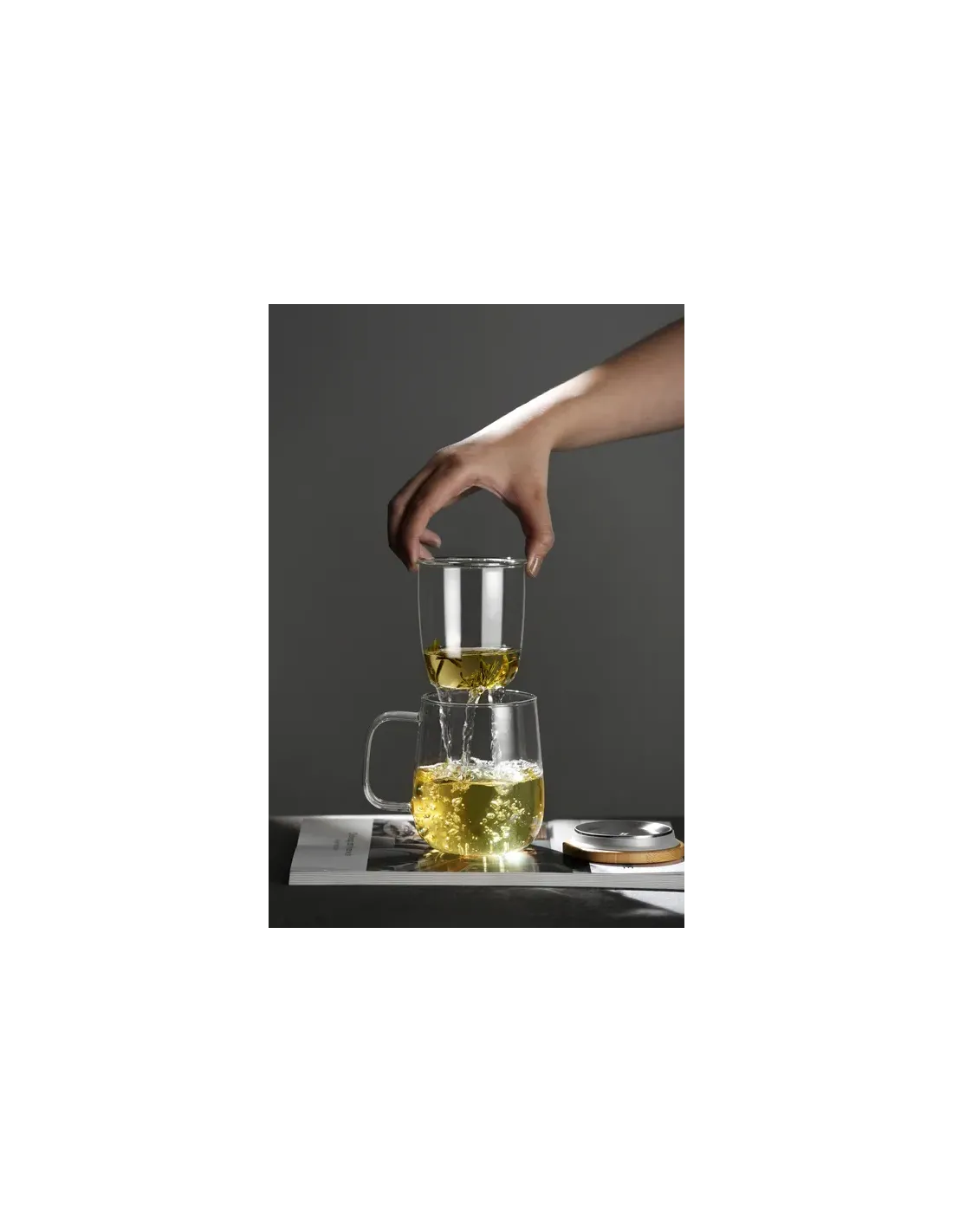 Korpus szklanki wykonano ze szkła, które doskonale pasuje do naparów – jest neutralne dla smaku i pozwala obserwować proces parzenia. Widać, jak liście rozwijają się w wodzie, a kolor napoju zmienia się z minuty na minutę, co ułatwia kontrolę intensywności. To szczególnie przyjemne przy herbatach zielonych, delikatnych mieszankach ziołowych czy kwiatowych kompozycjach. Dodatkowym atutem jest szklany uchwyt – elegancki, spójny wizualnie i wygodny w użytkowaniu. Uchwyt zapewnia pewniejszy chwyt i pozwala komfortowo korzystać ze szklanki, gdy napój jest gorący.