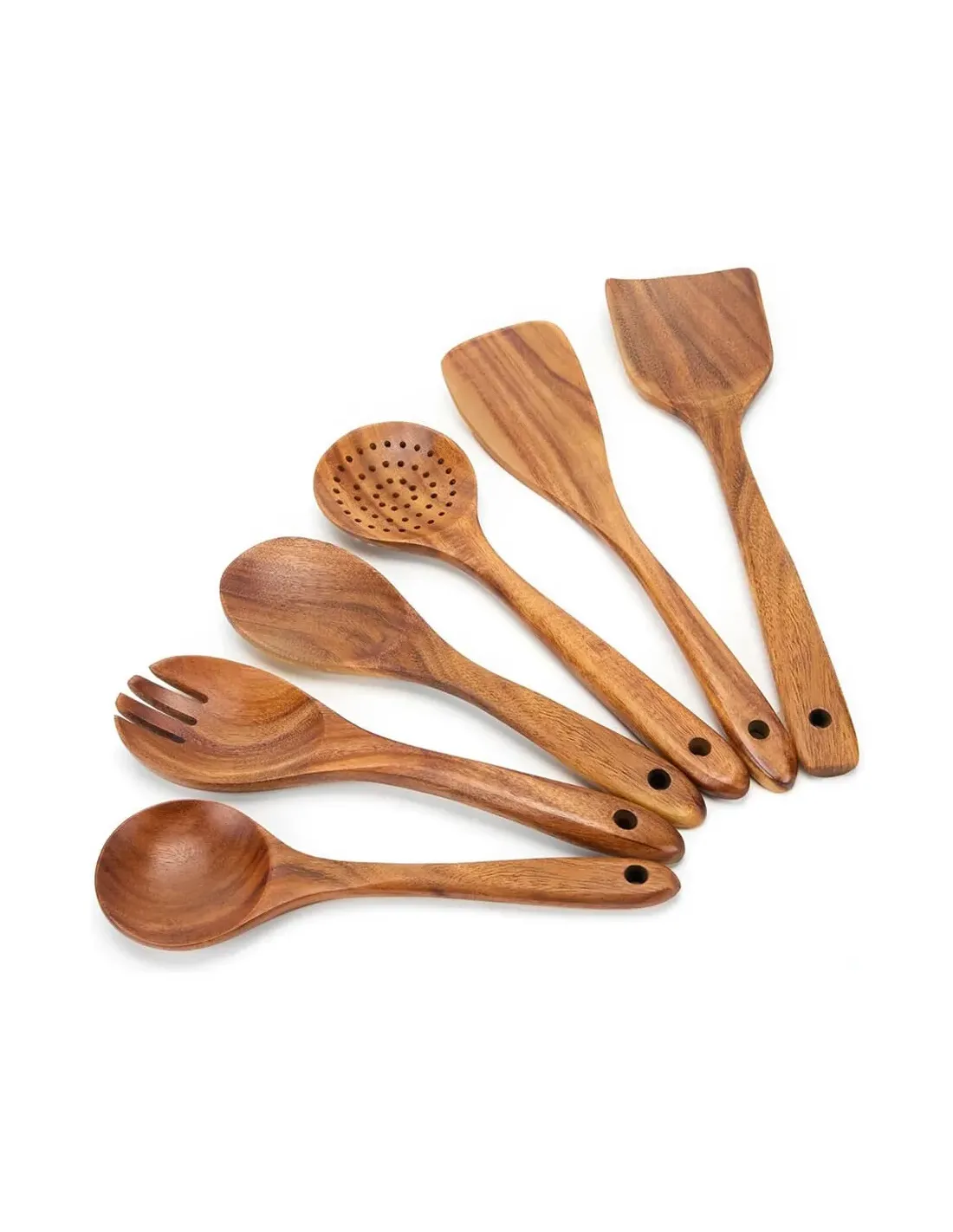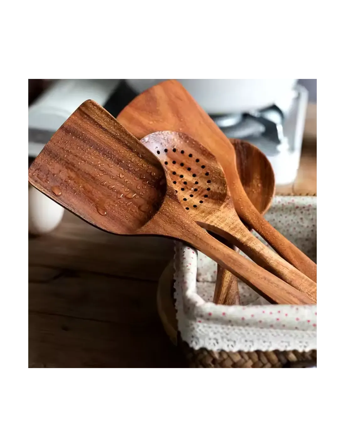 Szukasz przyborów, które są jednocześnie praktyczne, bezpieczne dla naczyń i po prostu dobrze wyglądają na blacie? Ten zestaw drewnianych akcesoriów kuchennych z drewna tekowego to komplet, który sprawdzi się w codziennym gotowaniu – od mieszania sosów, przez przewracanie naleśników, aż po serwowanie sałatek. W jednym zestawie otrzymujesz aż 7 funkcjonalnych elementów, dzięki czemu nie musisz kompletować przyborów pojedynczo. Każde narzędzie ma inne zastosowanie i kształt, więc łatwo dopasujesz je do konkretnych zadań w kuchni: do delikatnego mieszania, nabierania, odcedzania czy przenoszenia potraw z patelni na talerz.