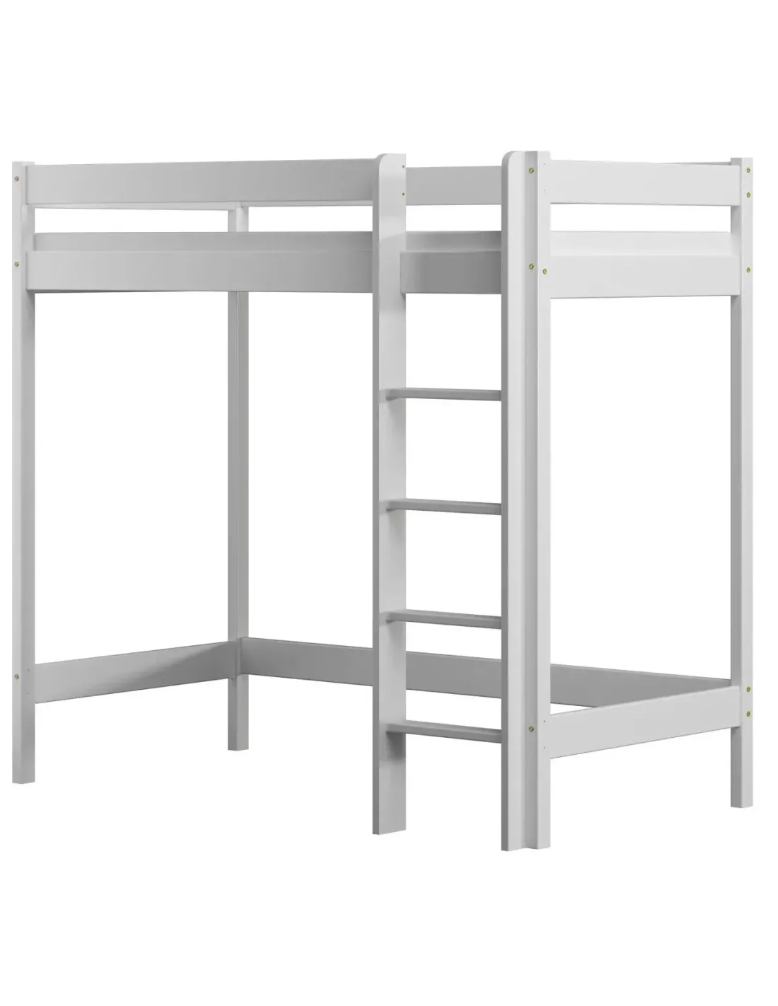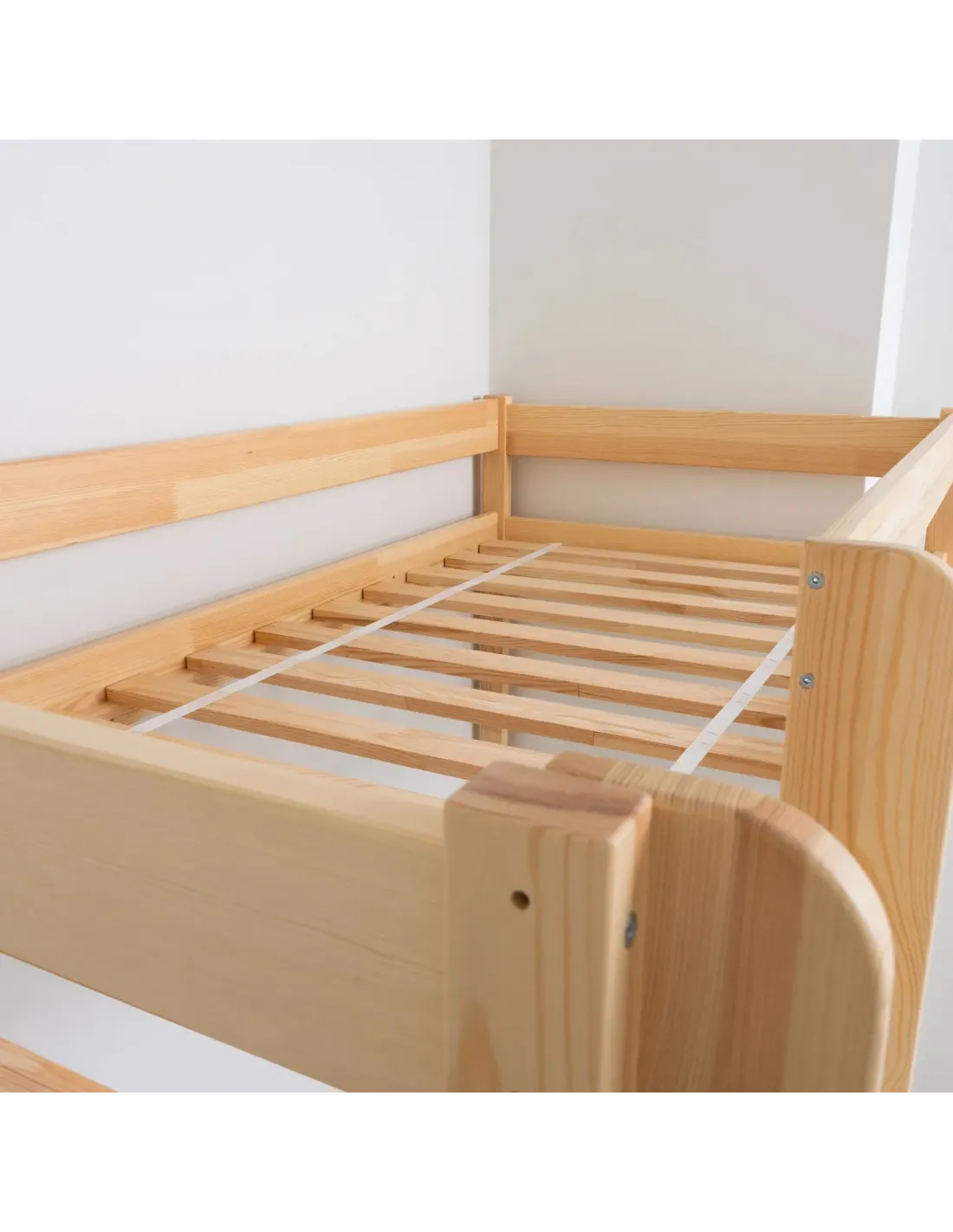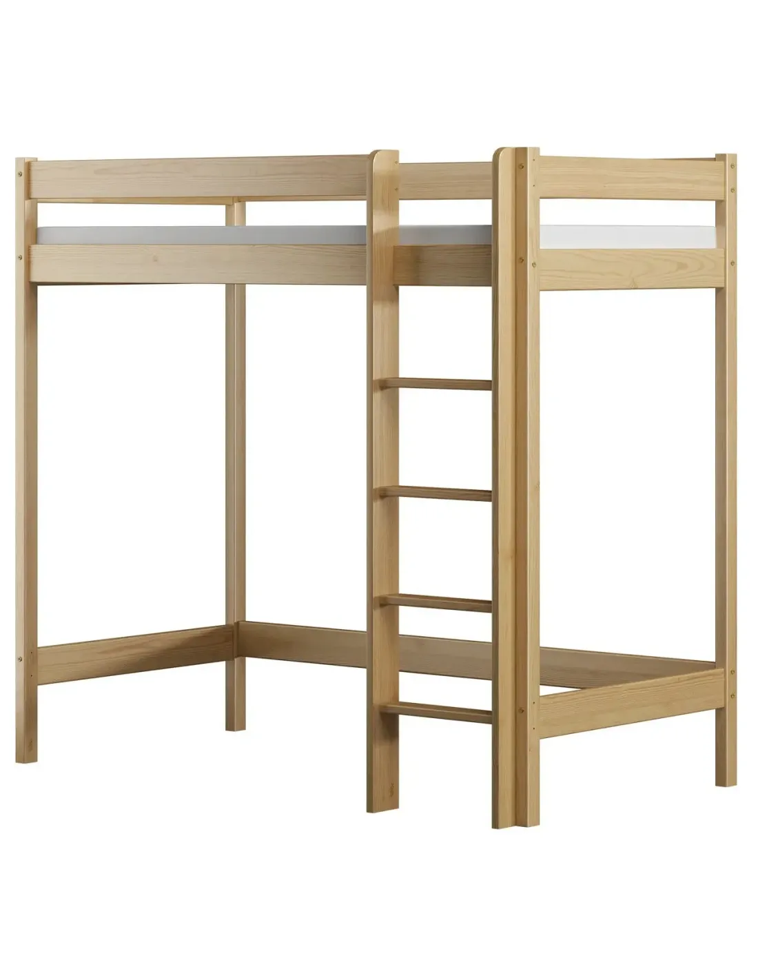 Konstrukcja antresoli pozwala maksymalnie wykorzystać przestrzeń, dlatego jest to idealne rozwiązanie do małych mieszkań, takich jak kawalerka, a także do każdego małego pokoju, w którym liczy się oszczędność miejsca i świadome zagospodarowanie przestrzeni. Wysokość pod łóżkiem wynosi aż 127 cm, a przy wyborze wyższego modelu 147 cm, dzięki czemu dziecko może swobodnie korzystać z powierzchni pod meblem. Przestrzeń można dowolnie zagospodarować jako kącik czytelniczy, strefę nauki z biurkiem, miejsce do zabawy, pojemny schowek albo dodatkowe miejsce do przechowywania. Takie rozwiązanie pozwala wykorzystać przestrzeń w praktyczny sposób i przechowywać najpotrzebniejsze rzeczy bez utraty estetyki wnętrza. Drewniana rama malowana jest ekologicznymi, nietoksycznymi farbami wodnymi, które spełniają normę EN 71-3, dlatego model odpowiada na aktualne normy bezpieczeństwa i potrzeby świadomych rodziców. Wszystkie krawędzie zostały starannie wykończone i zaokrąglone, co zwiększa bezpieczeństwo i wygodę użytkowania. Pełne, solidne barierki ochronne, a także możliwość wyboru strony montażu antypoślizgowej drabinki dodatkowo wpływają na bezpieczne użytkowanie. Barierki ochronne oraz stabilne drabinki to bardzo ważne elementy, dzięki którym dziecko może bezpiecznie korzystać z łóżka każdego dnia. Komfort użytkowania idzie tutaj w parze z estetyką i trwałością.