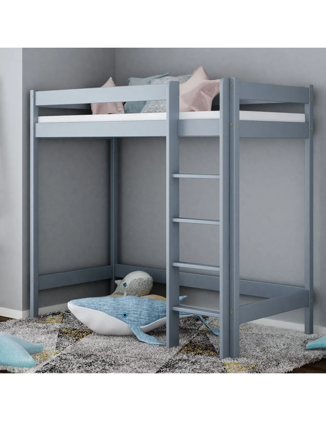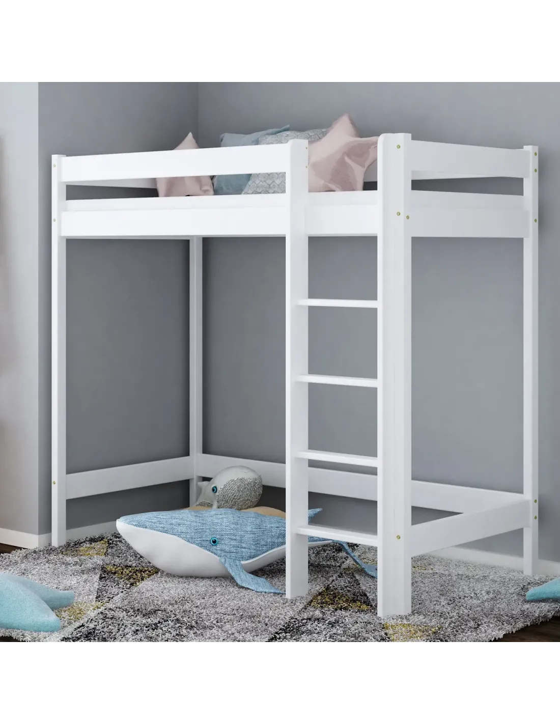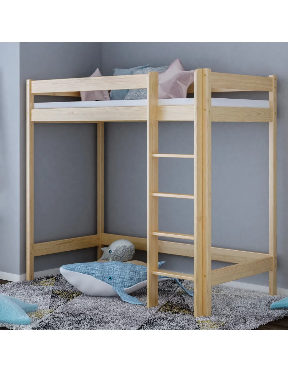 Konstrukcja antresoli pozwala maksymalnie wykorzystać przestrzeń, dlatego jest to idealne rozwiązanie do małych mieszkań, takich jak kawalerka, a także do każdego małego pokoju, w którym liczy się oszczędność miejsca i świadome zagospodarowanie przestrzeni. Wysokość pod łóżkiem wynosi aż 127 cm, a przy wyborze wyższego modelu 147 cm, dzięki czemu dziecko może swobodnie korzystać z powierzchni pod meblem. Przestrzeń można dowolnie zagospodarować jako kącik czytelniczy, strefę nauki z biurkiem, miejsce do zabawy, pojemny schowek albo dodatkowe miejsce do przechowywania. Takie rozwiązanie pozwala wykorzystać przestrzeń w praktyczny sposób i przechowywać najpotrzebniejsze rzeczy bez utraty estetyki wnętrza. Drewniana rama malowana jest ekologicznymi, nietoksycznymi farbami wodnymi, które spełniają normę EN 71-3, dlatego model odpowiada na aktualne normy bezpieczeństwa i potrzeby świadomych rodziców. Wszystkie krawędzie zostały starannie wykończone i zaokrąglone, co zwiększa bezpieczeństwo i wygodę użytkowania. Pełne, solidne barierki ochronne, a także możliwość wyboru strony montażu antypoślizgowej drabinki dodatkowo wpływają na bezpieczne użytkowanie. Barierki ochronne oraz stabilne drabinki to bardzo ważne elementy, dzięki którym dziecko może bezpiecznie korzystać z łóżka każdego dnia. Komfort użytkowania idzie tutaj w parze z estetyką i trwałością.