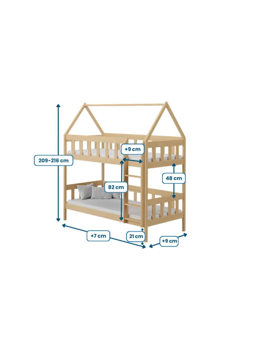 Konstrukcja łóżka została starannie opracowana, aby zapewniać bezpieczeństwo i wygodę codziennego użytkowania. Górny poziom wyposażono w wysokie barierki ochronne, które chronią dziecko podczas snu. Z kolei wygodna drabinka ułatwia wchodzenie i schodzenie, dzięki czemu korzystanie z mebla jest komfortowe również dla młodszych użytkowników. Dodatkowym atutem są zaokrąglone krawędzie, które zwiększają bezpieczeństwo i podnoszą komfort codziennego użytkowania. Łóżko zostało wykonane z drewna sosnowego, a jego najważniejsze elementy są wykonane z litego drewna sosnowego, co przekłada się na wysoką trwałość i odporność na intensywne użytkowanie. Naturalne drewno sosnowe nie tylko gwarantuje stabilność, ale też wprowadza do wnętrza ciepło, tworząc przyjazną atmosferę w pokoju dziecka. Dzięki temu model zachowuje swoją estetykę i trwałość na lata.