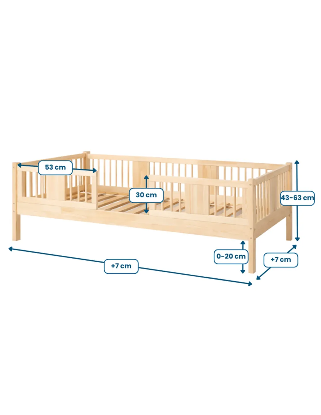 Łóżko wykonane zostało z klejonego drewna sosnowego, dzięki czemu jest to solidne łóżko drewniane o wysokiej trwałości i stabilnej konstrukcji. Charakterystycznym elementem modelu są subtelne, toczone szczebelki w frontach, które nadają całości przyjazny, dziecięcy charakter i podkreślają jego stylowy wygląd. Całość doskonale wpisuje się w skandynawski i klasyczny bądź też boho styl wnętrz, dlatego LUNA może być postrzegana jako łóżko jednoosobowe w różnych stylach – od aranżacji minimalistycznych po bardziej przytulne i dekoracyjne. Dużym atutem modelu jest bezpieczeństwo oraz wygoda codziennego użytkowania. Dokładnie szlifowane powierzchnie, zaokrąglone krawędzie oraz starannie wykończone elementy wpływają na wysoki komfort i ochronę najmłodszych. Solidny stelaż pod materac zapewnia odpowiednie podparcie ciała, co przekłada się na lepszy komfort snu prawidłowy wypoczynek. Choć model nie posiada klasycznego, wysokiego elementu, jakim jest zagłówek, jego przemyślana forma i proporcje sprawiają, że całość prezentuje się bardzo estetycznie i nowocześnie.