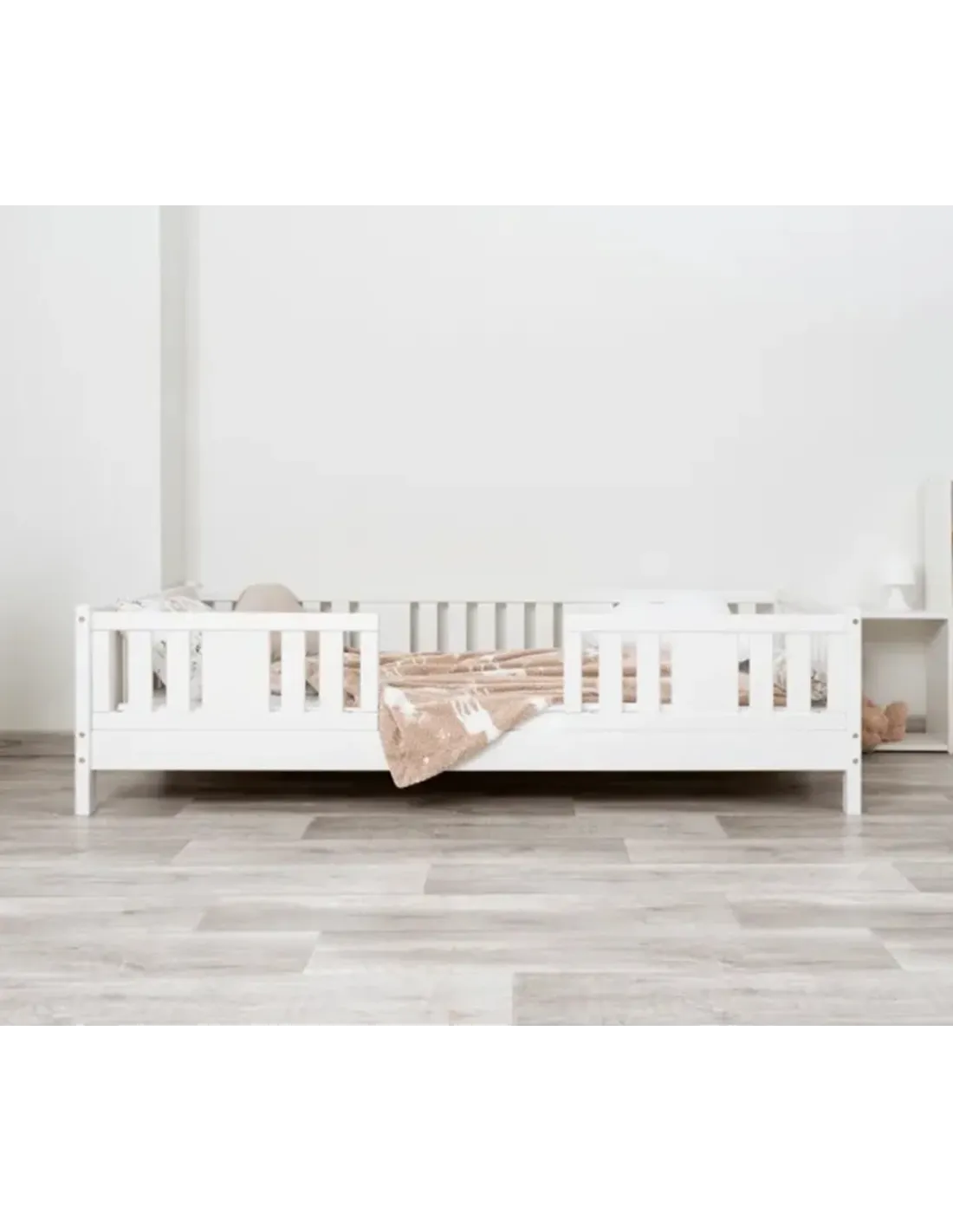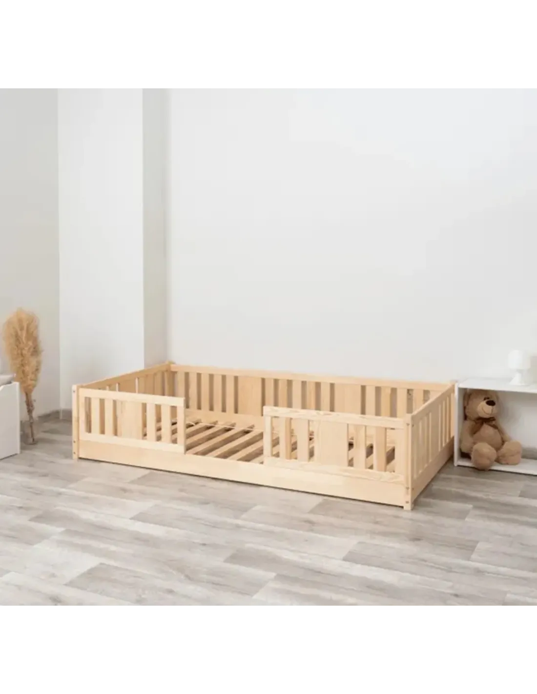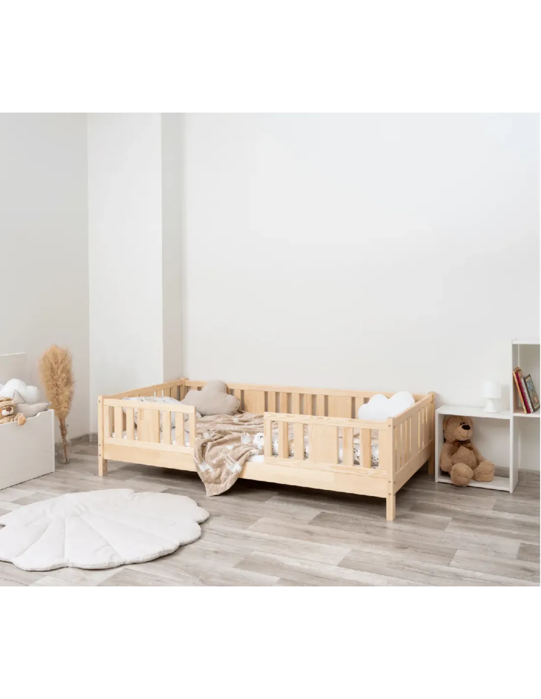 Warianty o wysokości 10 cm i 20 cm zapewniają dodatkowy prześwit pod łóżkiem, co sprzyja higienie i ułatwia sprzątanie. Tę przestrzeń można również wykorzystać na praktyczną szufladę, która pozwala wygodnie przechowywać pościel, zabawki, sezonowe tekstylia lub koce. Dzięki temu model może pełnić funkcję łóżka jednoosobowego z pojemnikiem na pościel. Taki pojemnik zwiększa codzienną funkcjonalność mebla i pozwala na efektywne wykorzystanie przestrzeni, szczególnie w przypadku mniejszych pomieszczeń oraz ograniczonej przestrzeni. To bardzo praktyczne dodatkowe miejsce do organizacji dziecięcego pokoju.