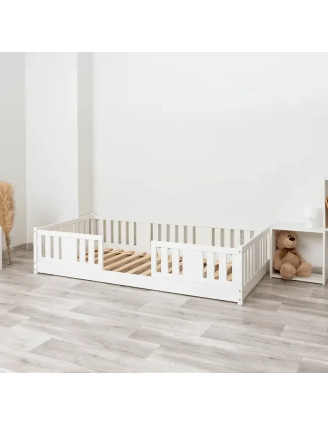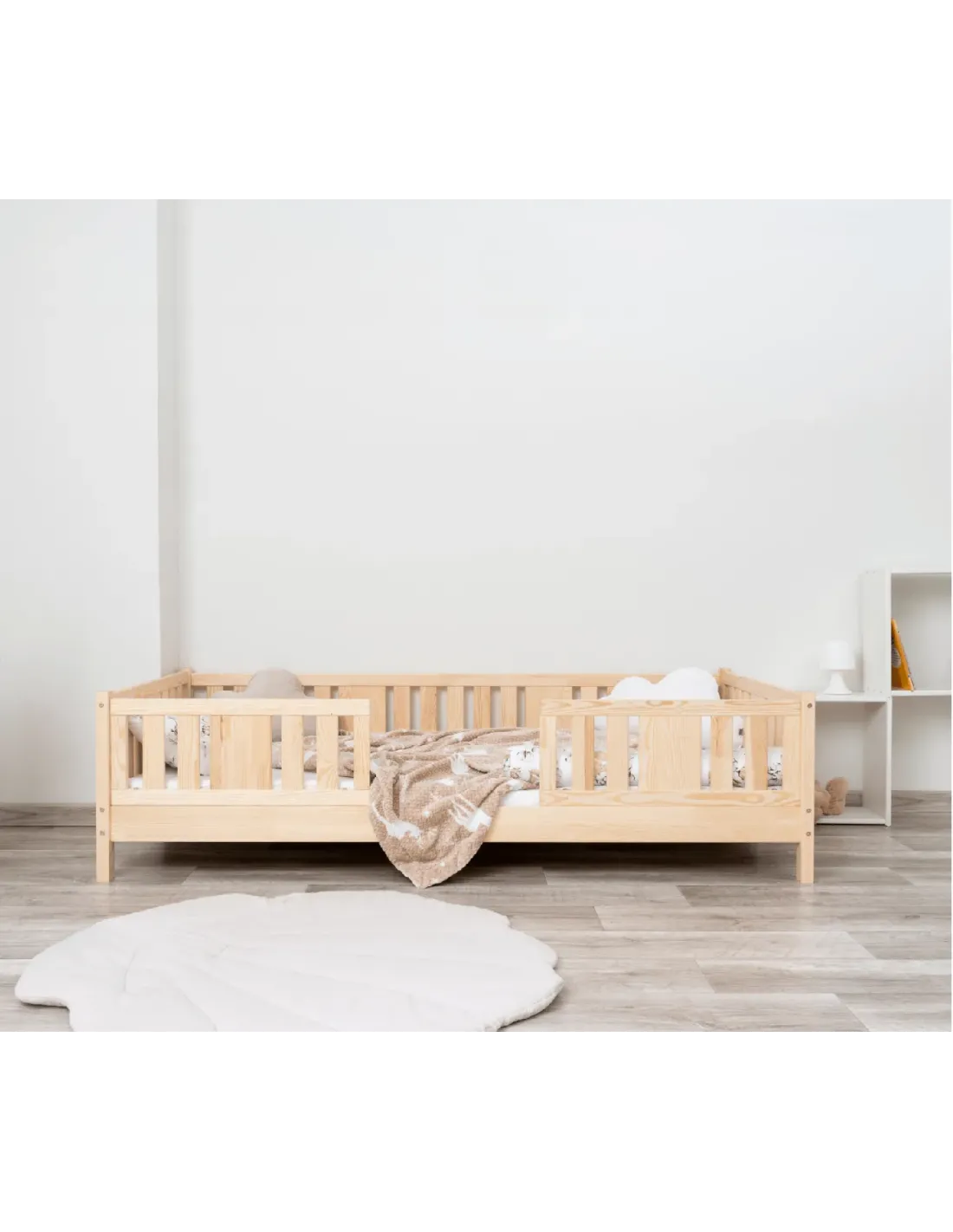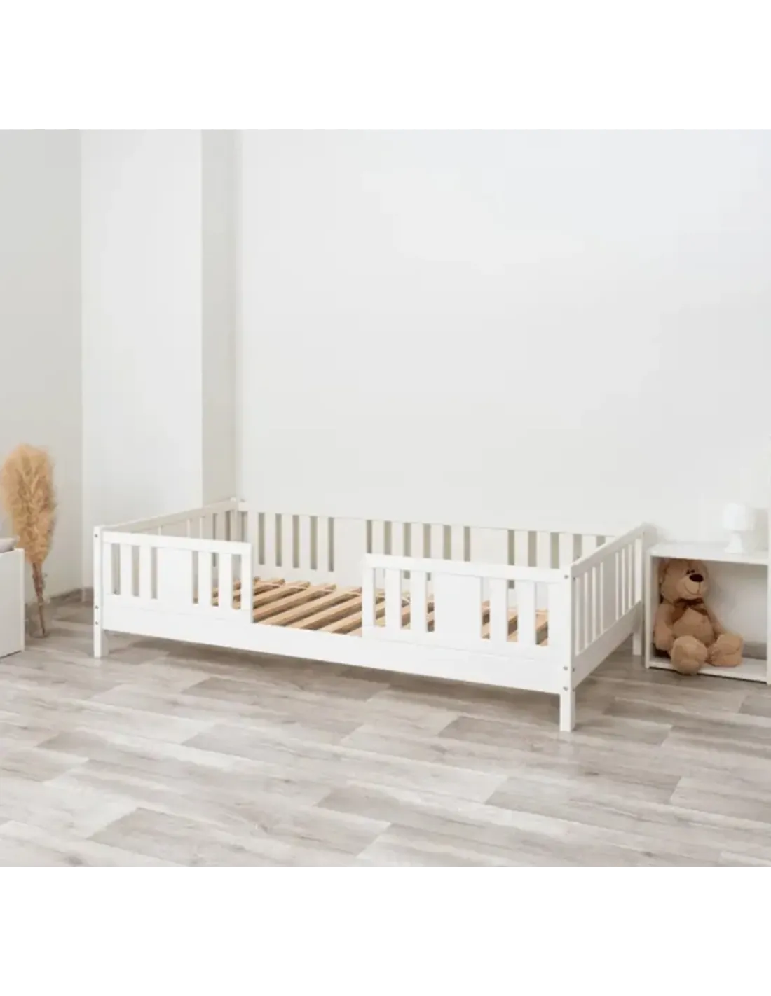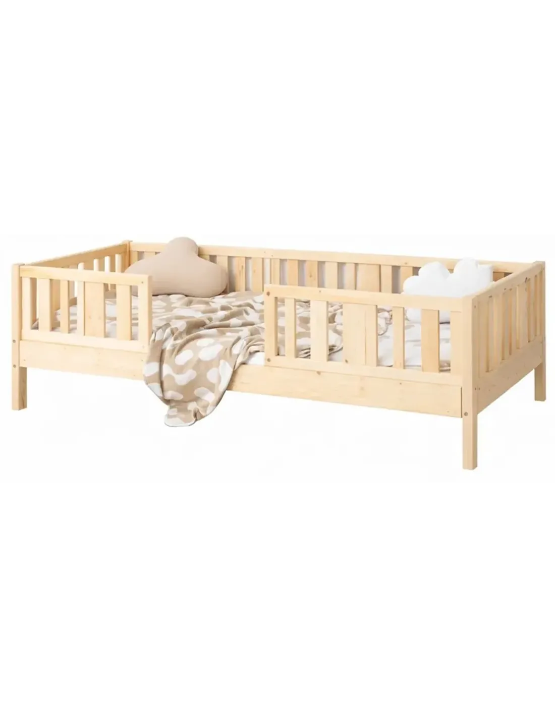 Warianty o wysokości 10 cm i 20 cm zapewniają dodatkowy prześwit pod łóżkiem, co sprzyja higienie i ułatwia sprzątanie. Tę przestrzeń można również wykorzystać na praktyczną szufladę, która pozwala wygodnie przechowywać pościel, zabawki, sezonowe tekstylia lub koce. Dzięki temu model może pełnić funkcję łóżka jednoosobowego z pojemnikiem na pościel. Taki pojemnik zwiększa codzienną funkcjonalność mebla i pozwala na efektywne wykorzystanie przestrzeni, szczególnie w przypadku mniejszych pomieszczeń oraz ograniczonej przestrzeni. To bardzo praktyczne dodatkowe miejsce do organizacji dziecięcego pokoju.