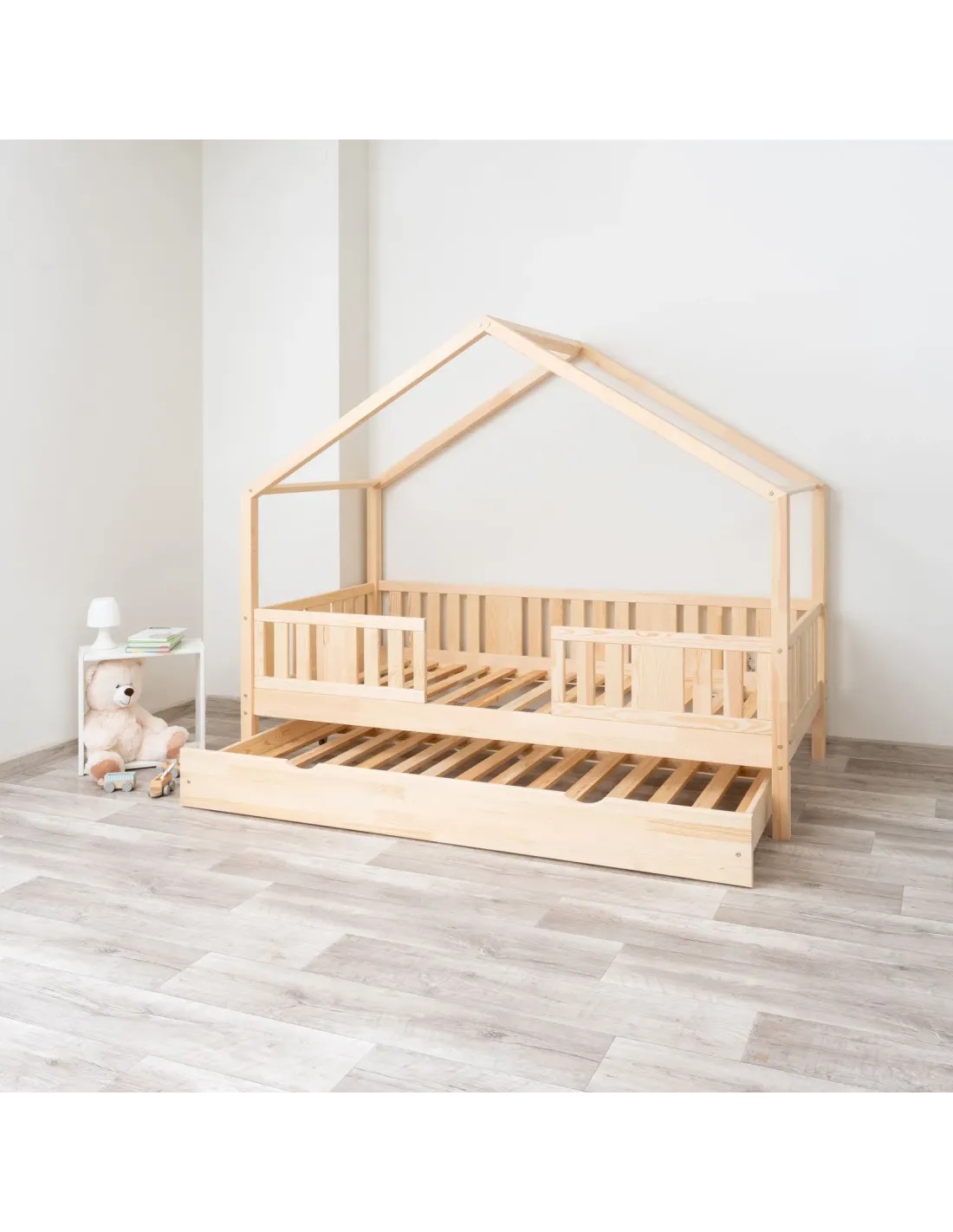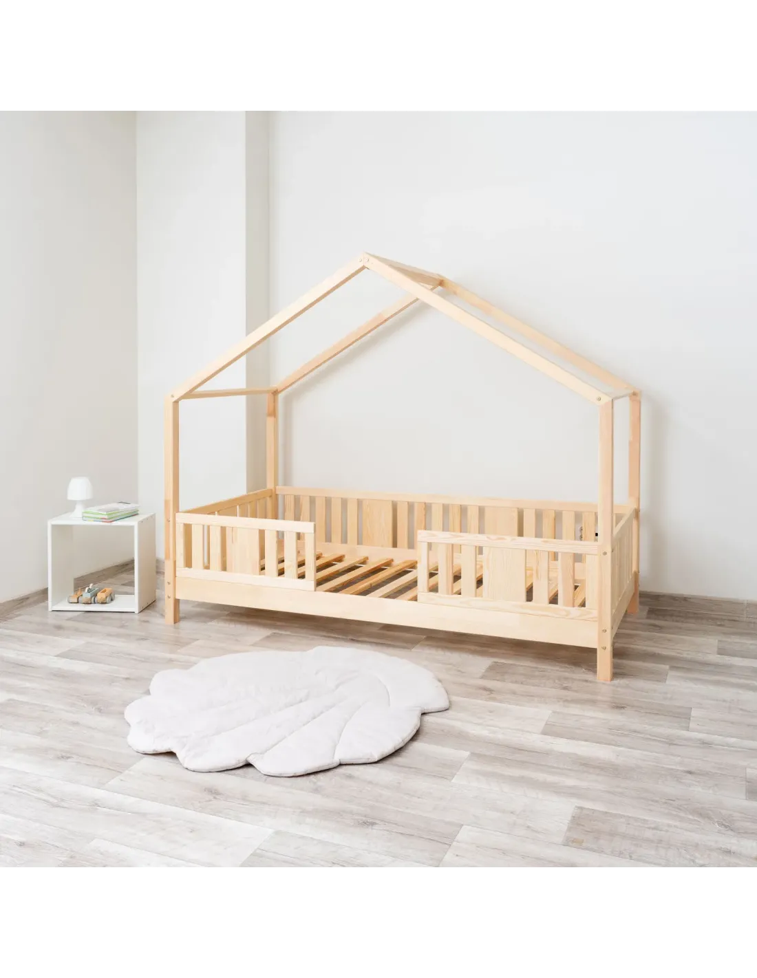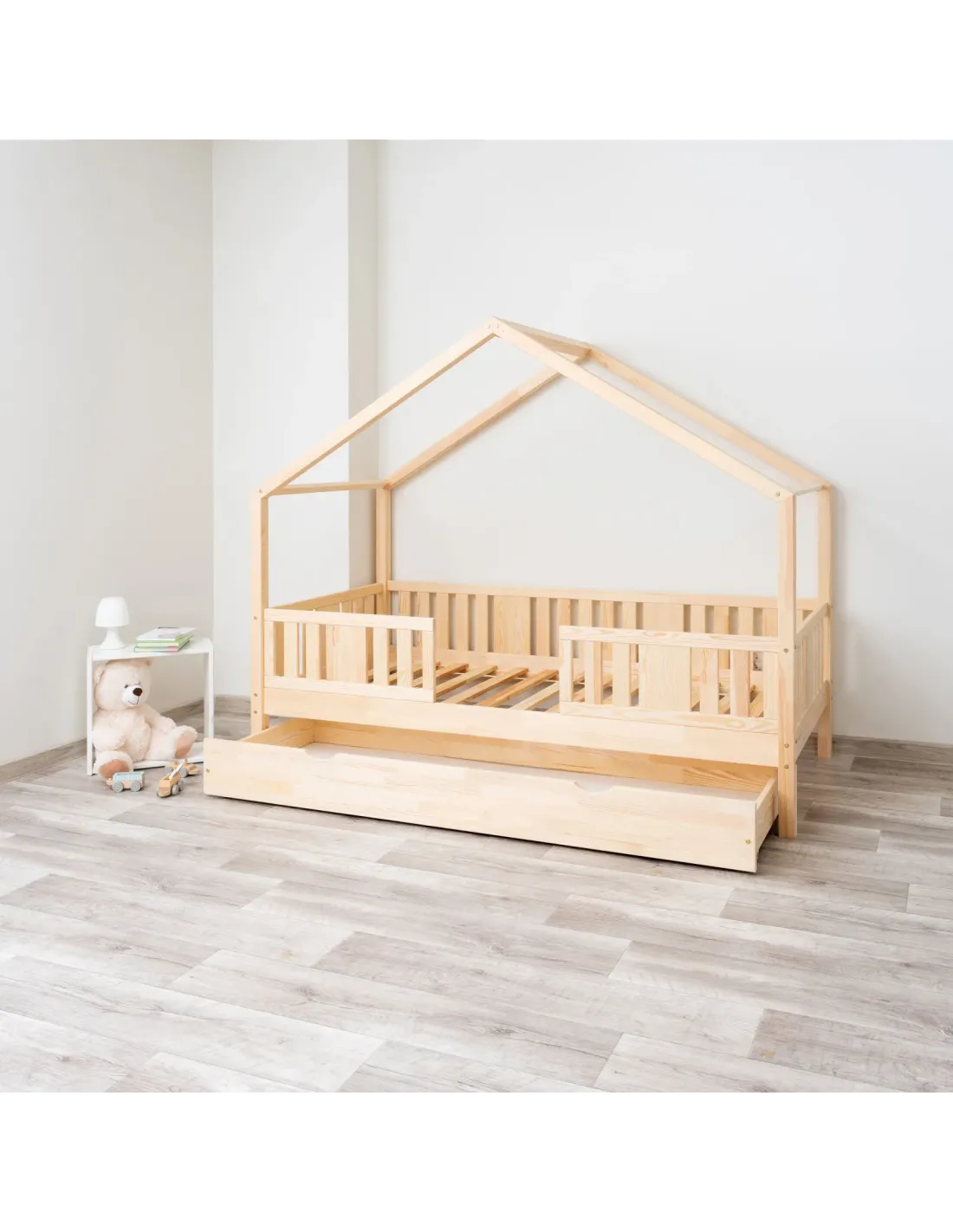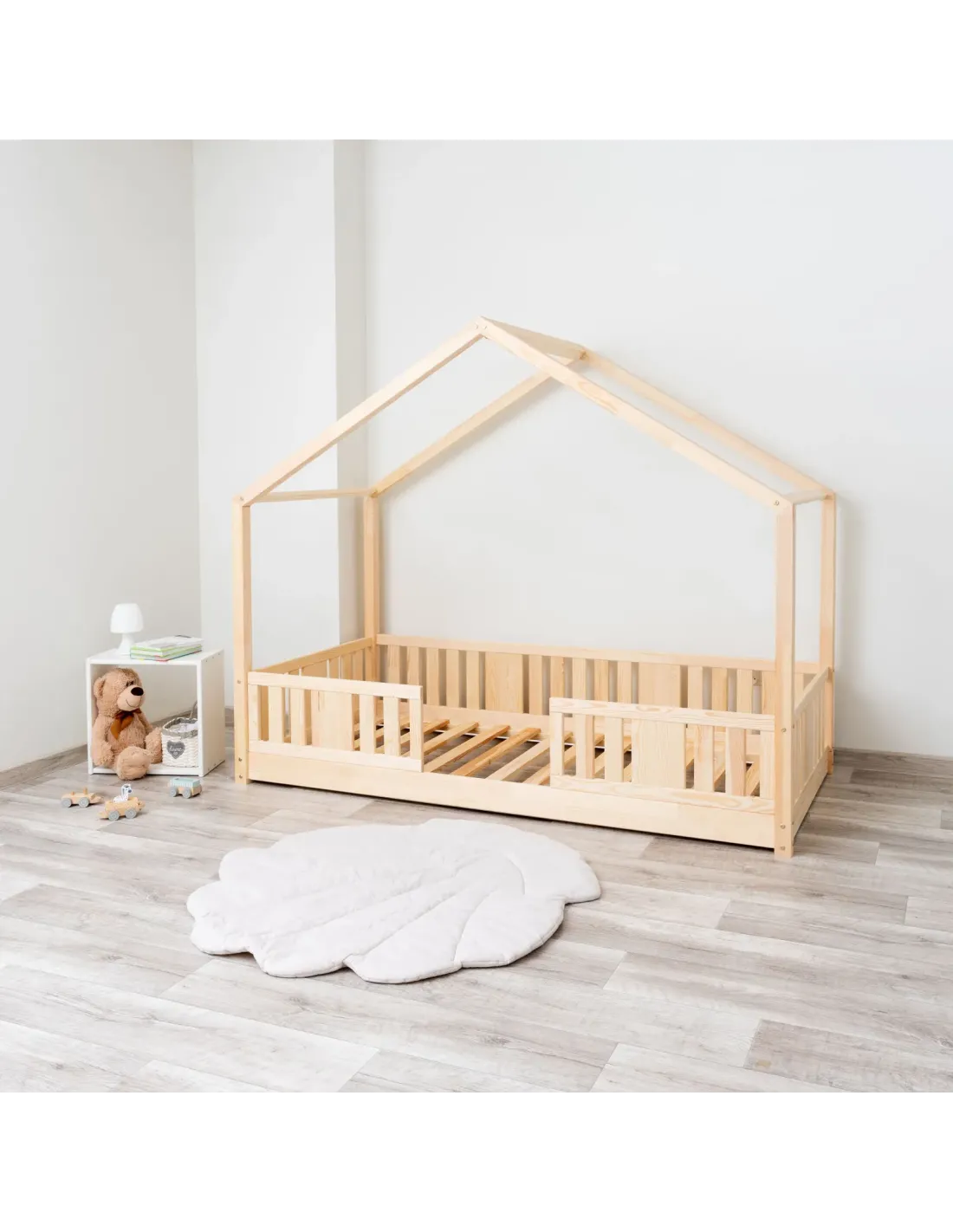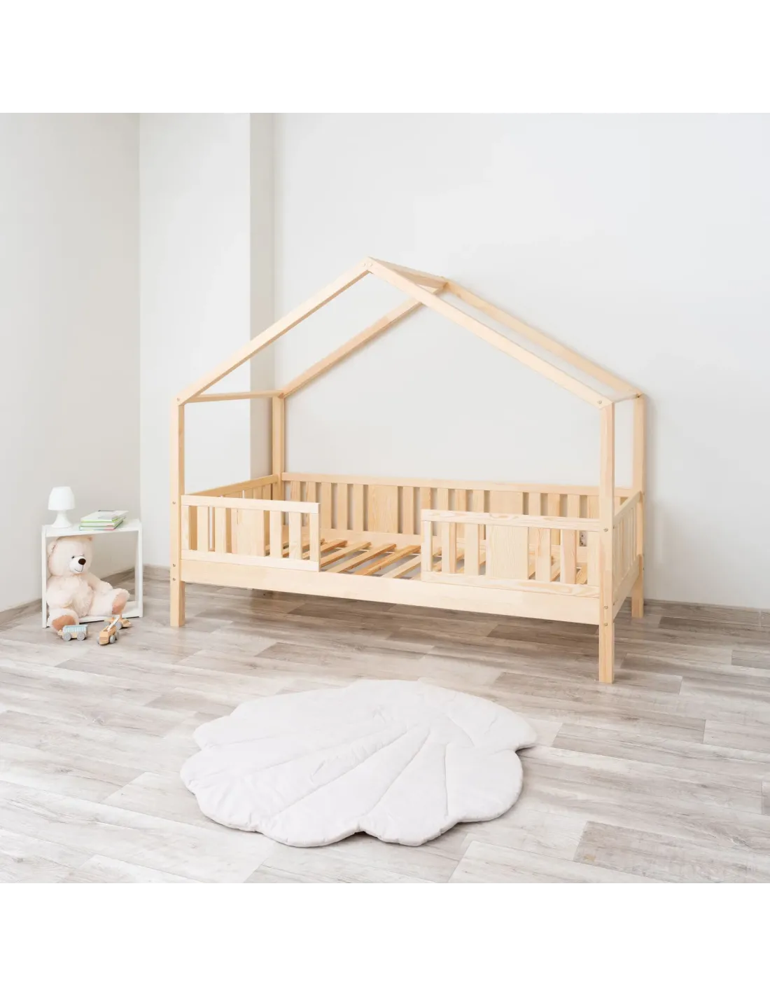 Łóżko dziecięce domek NIKO SHORT to niskoprofilowe łóżko pojedyncze zaprojektowane z myślą o najmłodszych dzieciach, które rozpoczynają swoją przygodę z samodzielnym spaniem. Ten jednoosobowy model łączy naturalne materiały, przyjazną formę domku oraz bezpieczną konstrukcję, dzięki czemu doskonale sprawdzi się jako pierwsze łóżko po łóżeczku niemowlęcym. To propozycja dla rodziców, którzy chcą znaleźć łóżko trwałe, estetyczne i funkcjonalne, a jednocześnie dopasowane do potrzeb najmłodszych użytkowników. Cała konstrukcja została wykonana z klejonego drewna sosnowego, dlatego model należy do kategorii solidnych i trwałych łóżek drewnianych. Naturalne drewno wyróżnia się wysoką stabilnością, estetycznym wyglądem oraz odpornością na codzienne użytkowanie. Powierzchnia drewna została starannie wyszlifowana, a wszystkie krawędzie delikatnie zaokrąglone, co znacząco zwiększa bezpieczeństwo podczas zabawy i codziennego korzystania z łóżka. Dzięki temu jest to wygodne i bezpieczne miejsce do spania dla jednej osoby, które zapewnia wysoki komfort snu i dobrą jakość snu.