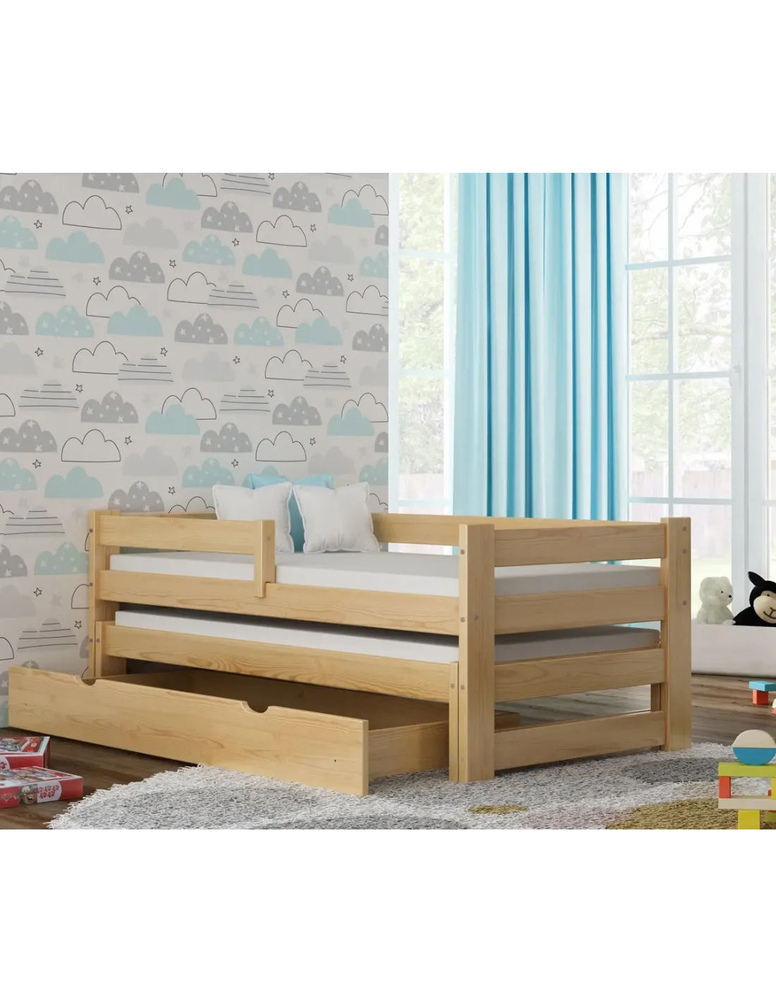 Łóżko PAWEŁEK DUO zostało zaprojektowane jako praktyczne rozwiązanie typu „łóżko w łóżku”, które znakomicie sprawdza się w pokojach współdzielonych przez rodzeństwo oraz tam, gdzie potrzebne jest dodatkowe miejsce do spania bez zajmowania cennej przestrzeni w ciągu dnia. Górna część konstrukcji tworzy pełnowartościowe, wygodne miejsce wypoczynku, natomiast dolne łóżko można w prosty sposób wysunąć, gdy zachodzi taka potrzeba. To inteligentne rozwiązanie pozwala lepiej organizować przestrzeń i zachować swobodę w mniejszych pomieszczeniach. Całość opiera się na solidnej konstrukcji z drewna sosnowego i płyty meblowej, co przekłada się na trwałość, stabilność oraz estetyczny wygląd. Dodatkowym atutem jest obecność barierki ochronnej, która zwiększa bezpieczeństwo użytkowania, szczególnie w przypadku młodszych dzieci. Dzięki starannemu wykonaniu, dopracowanym detalom i uniwersalnemu wzornictwu PAWEŁEK DUO łączy codzienną funkcjonalność z naturalnym, przytulnym charakterem drewna.