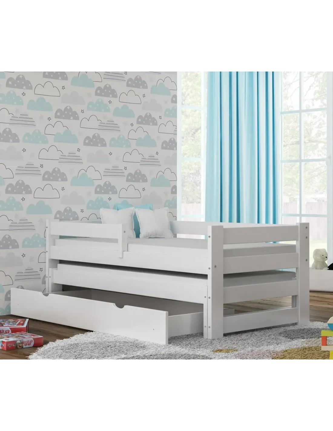 Dużą zaletą łóżka jest również jego solidne wykonanie i bezpieczeństwo użytkowania. Wszystkie elementy zostały zaprojektowane z myślą o komforcie dzieci i spokojnej codzienności rodziców. Konstrukcja posiada zaokrąglone krawędzie, co zwiększa bezpieczeństwo podczas użytkowania, a powierzchnie wykończono nietoksycznymi farbami wodnymi zgodnymi z normą EN 71-3. To oznacza, że mebel jest przyjazny dla domowników i odpowiedni do przestrzeni, w których liczy się zdrowe, bezpieczne otoczenie. Stabilna budowa oraz wytrzymałość do 190 kg sprawiają, że łóżko dobrze znosi codzienne użytkowanie i zachowuje swoje właściwości przez długi czas.