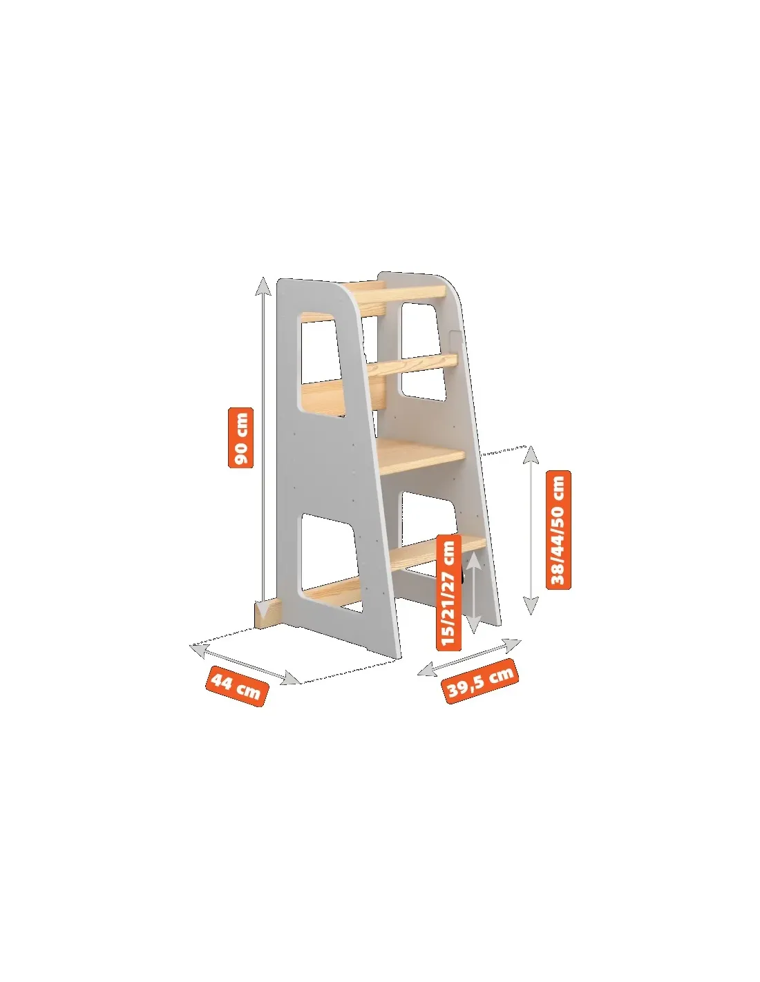 - 3-stopniowa regulacja podestu (38 cm, 44 cm, 50 cm) oraz stopni (15 cm, 21 cm, 27 cm)