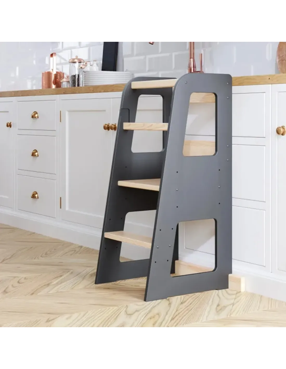 Ergonomia mebla została zaprojektowana tak, aby dziecko mogło swobodnie wchodzić i schodzić, a rodzic miał pewność, że konstrukcja pozostaje stabilna nawet podczas intensywnej zabawy. Dzięki regulacjom wysokości Kitchen Helper idealnie sprawdzi się zarówno w kuchni, jak i w pokoju dziecięcym jako mebel edukacyjny wspierający rozwój koordynacji ruchowej i samodzielności.