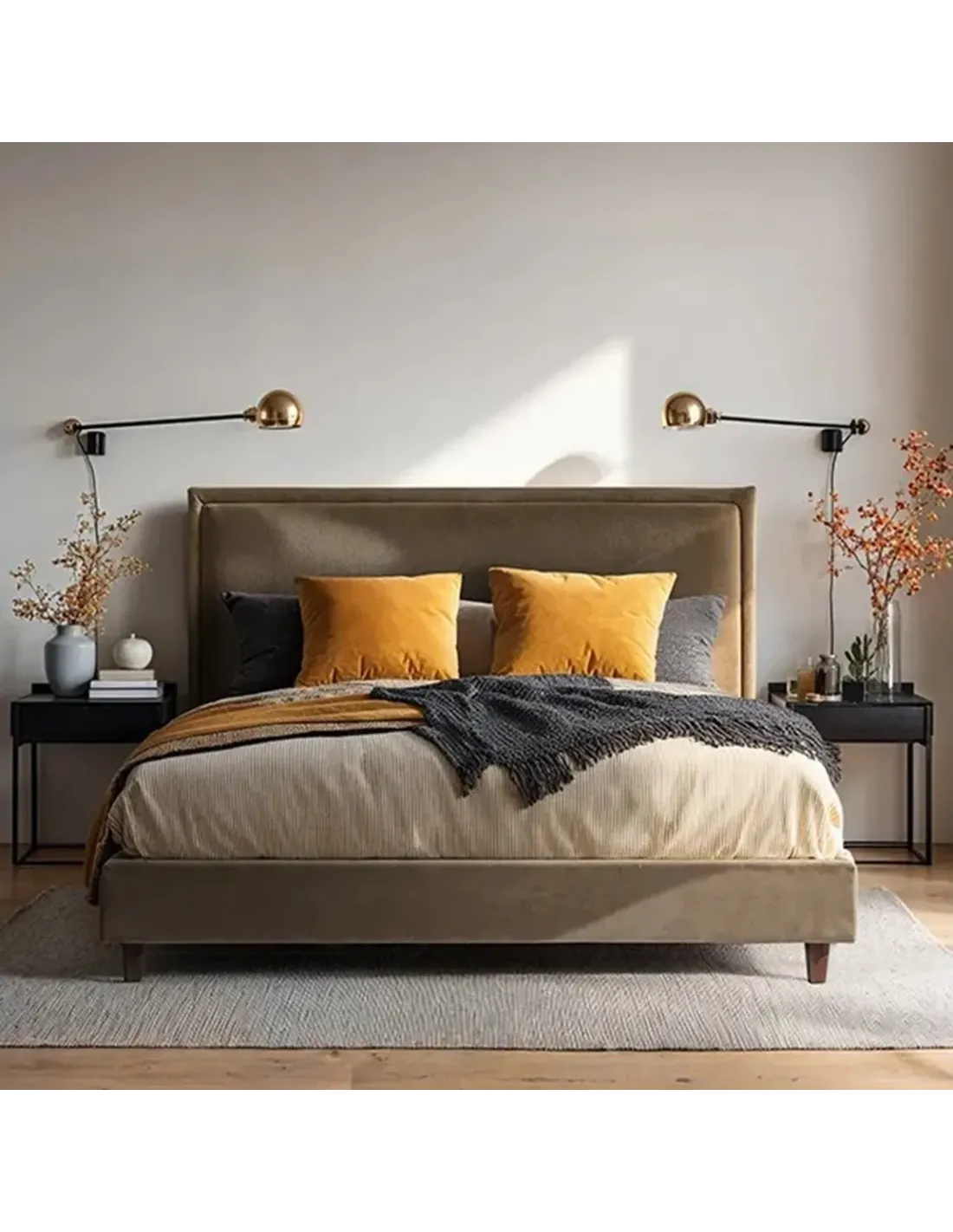 Centralnym elementem łóżka jest tapicerowany zagłówek (wezgłowie) o geometrycznej linii, który przyciąga uwagę subtelną, ale wyrazistą stylistyką. To, co szczególnie wyróżnia SAPRI, to gruba, dekoracyjna lamówka – podkreśla kształt wezgłowia, nadaje mu charakteru i sprawia, że całość prezentuje się bardziej luksusowo, mimo minimalistycznej formy. Takie wykończenie świetnie współgra z nowoczesnymi tkaninami i stonowaną paletą, a jednocześnie potrafi „podnieść” estetykę nawet w bardziej klasycznych wnętrzach.